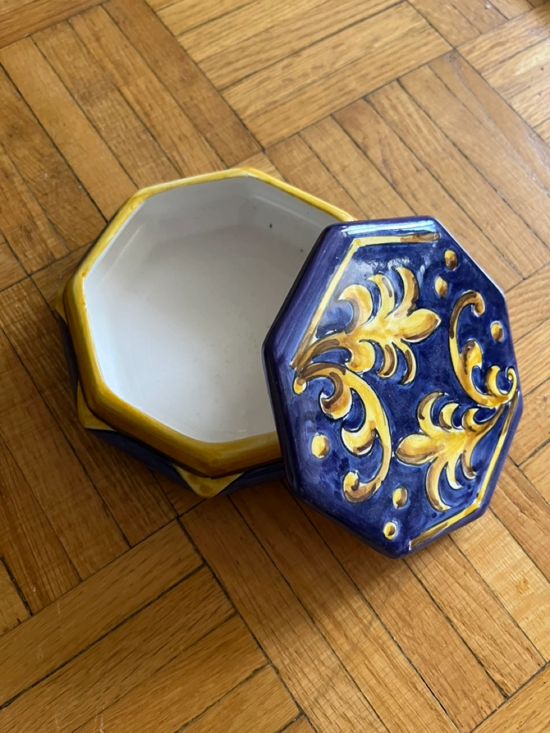 Octagonal Jewelry Box, Blue and Gold Floral Design