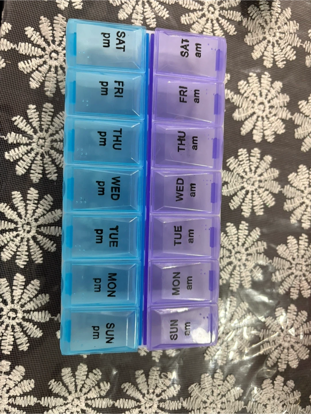 Keep your medication or vitamins organized with this weekly pill organizer, featuring separate compartments for morning and evening doses, labelled for each day of the week.