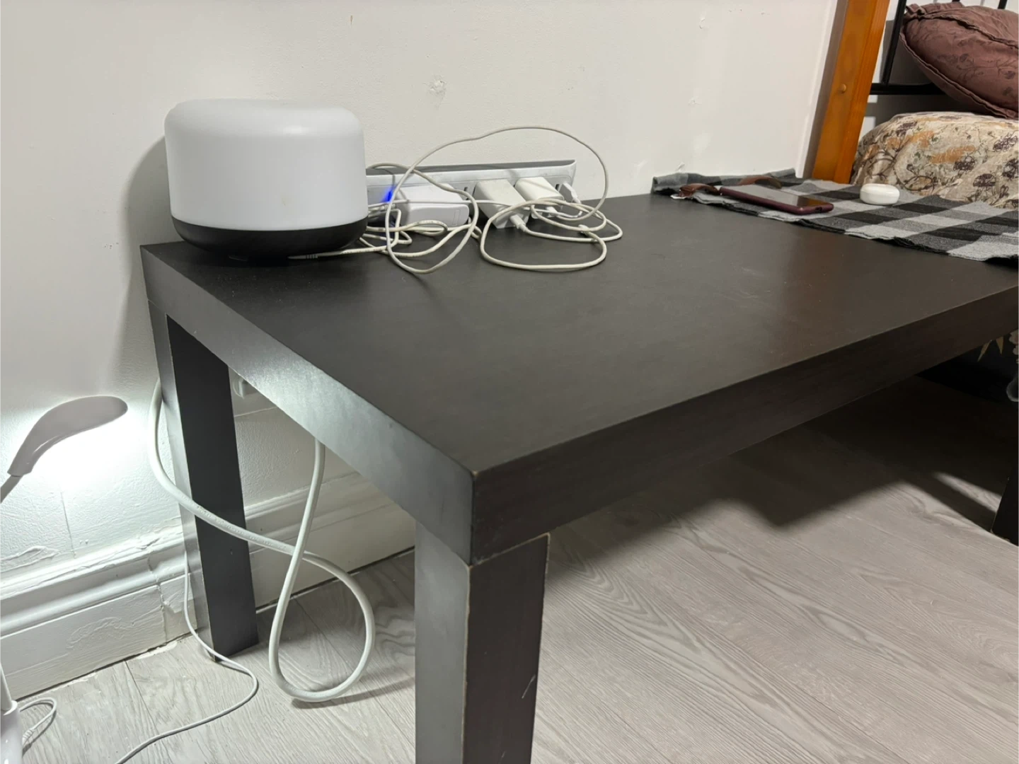 A black square side table. It's made of wood and has a simple, modern design. This table is great for placing next to a couch or bed.