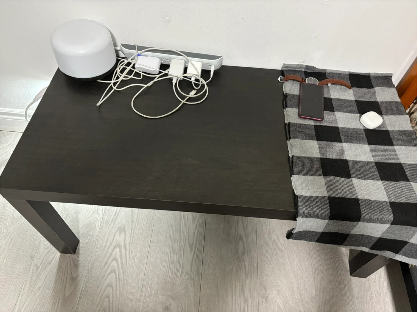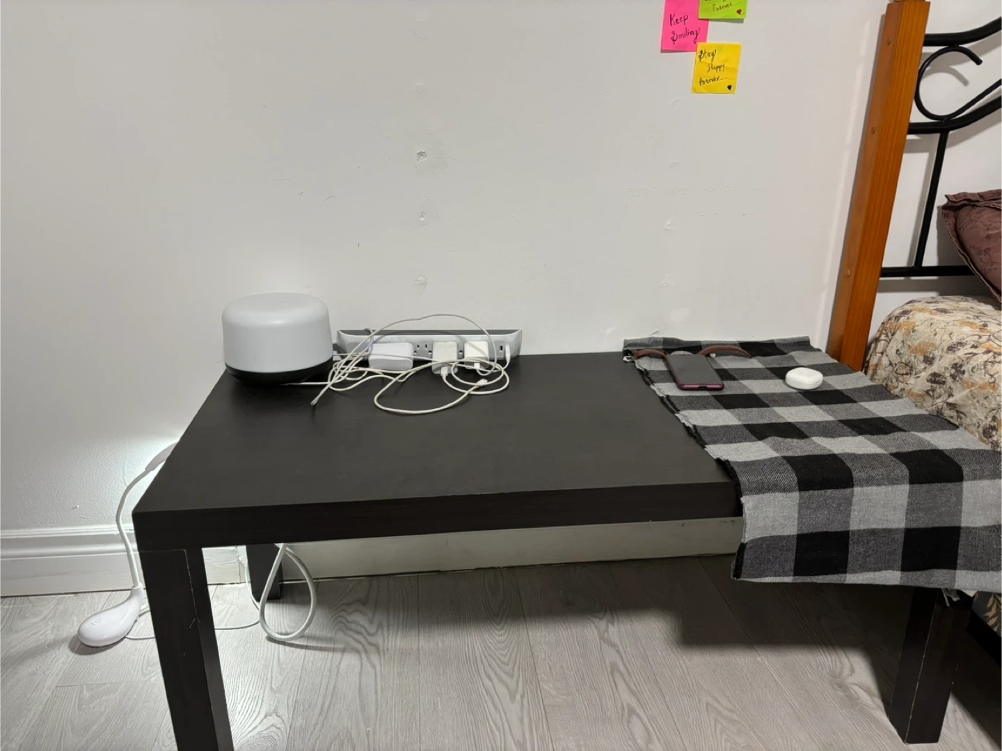 A black square side table. It's made of wood and has a simple, modern design. This table is great for placing next to a couch or bed.
