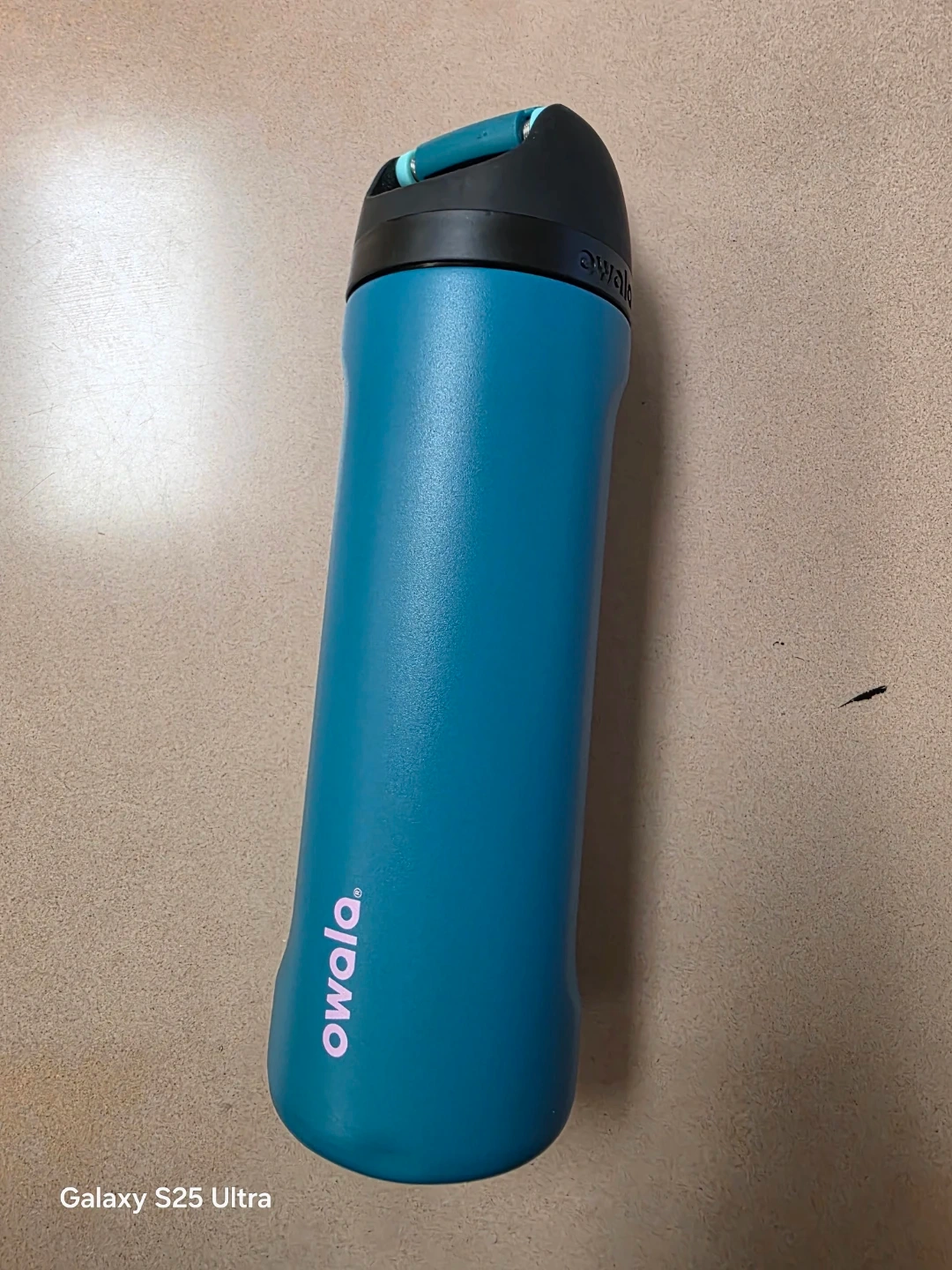 This is an Owala water bottle. It's teal in color and has a unique lid design. It's great for staying hydrated throughout the day!