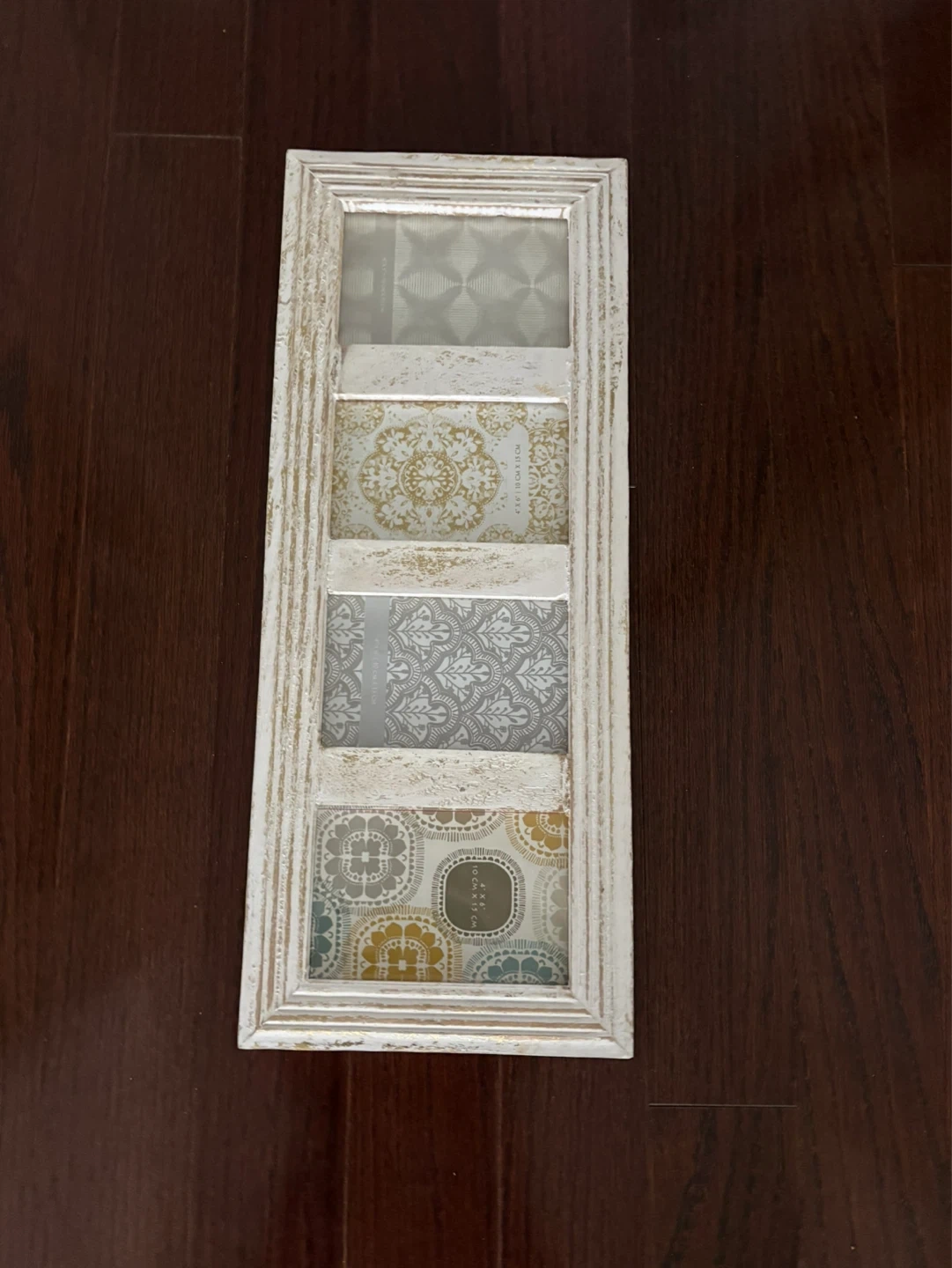 This white multi photo frame has a distressed finish for a shabby chic look. It holds four smaller photos, each with a unique patterned insert. The inserts are printed with a vintage-inspired design.