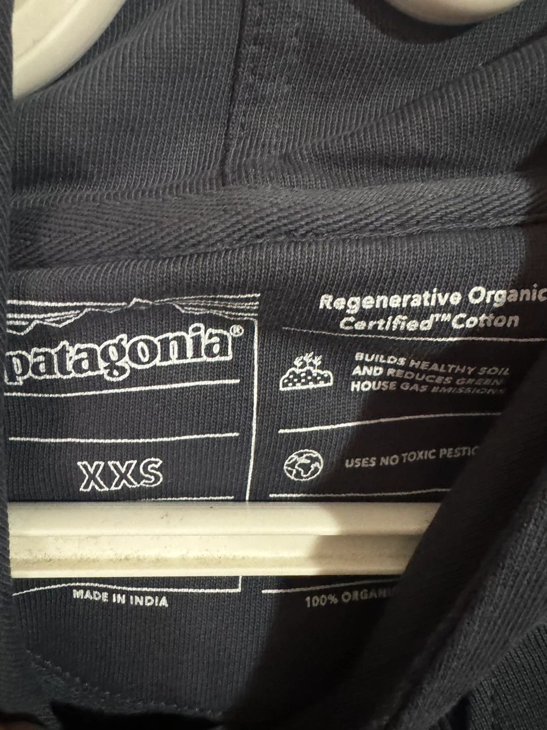 Patagonia hoodie made with 100% organic cotton. Regenerative organic certified cotton builds healthy soil and reduces greenhouse gas emissions. Uses no toxic pesticides. Made in India. XXS size.