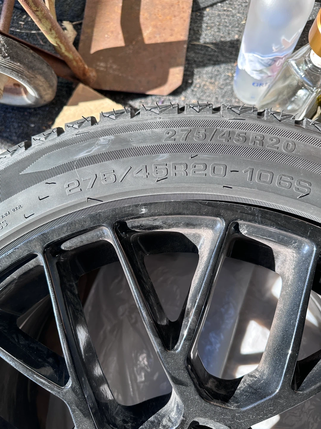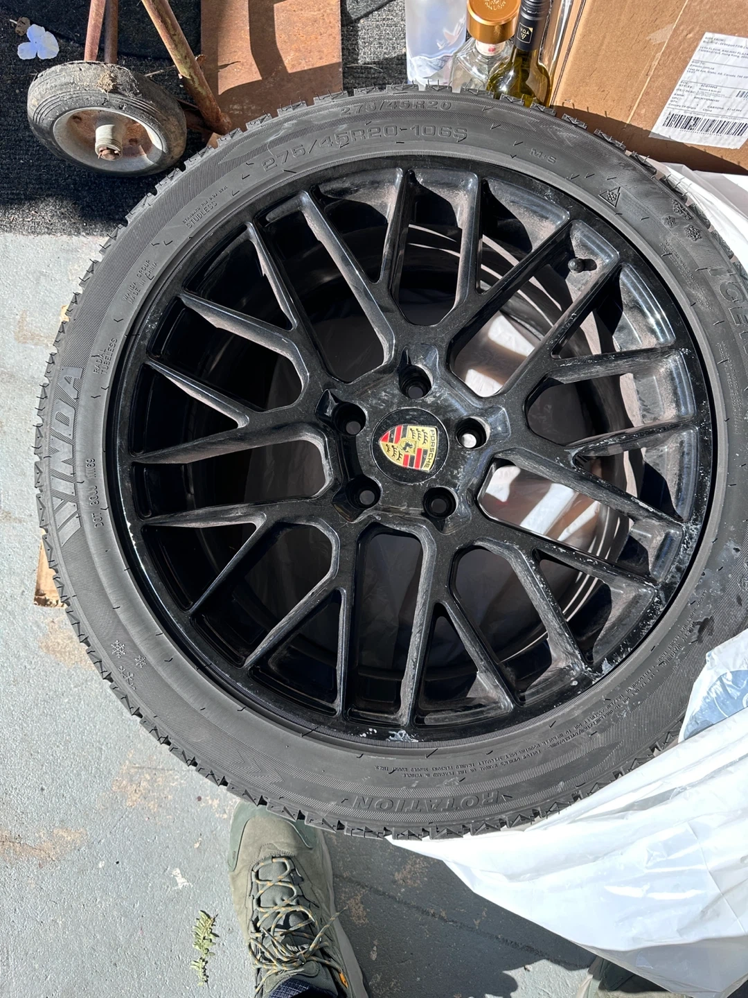 Four winter tire and wheel assembly. The tire size is 275/45R20. It's a black alloy wheel with the Porsche crest center cap. This is a winter tire for cold weather driving!