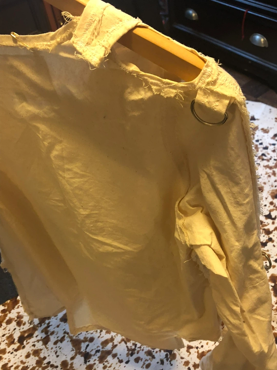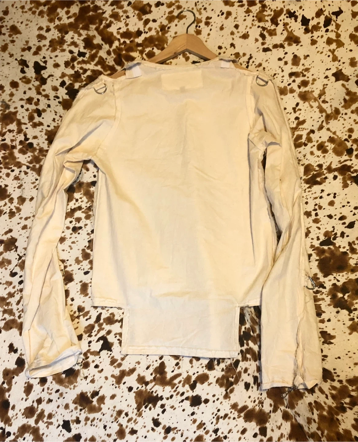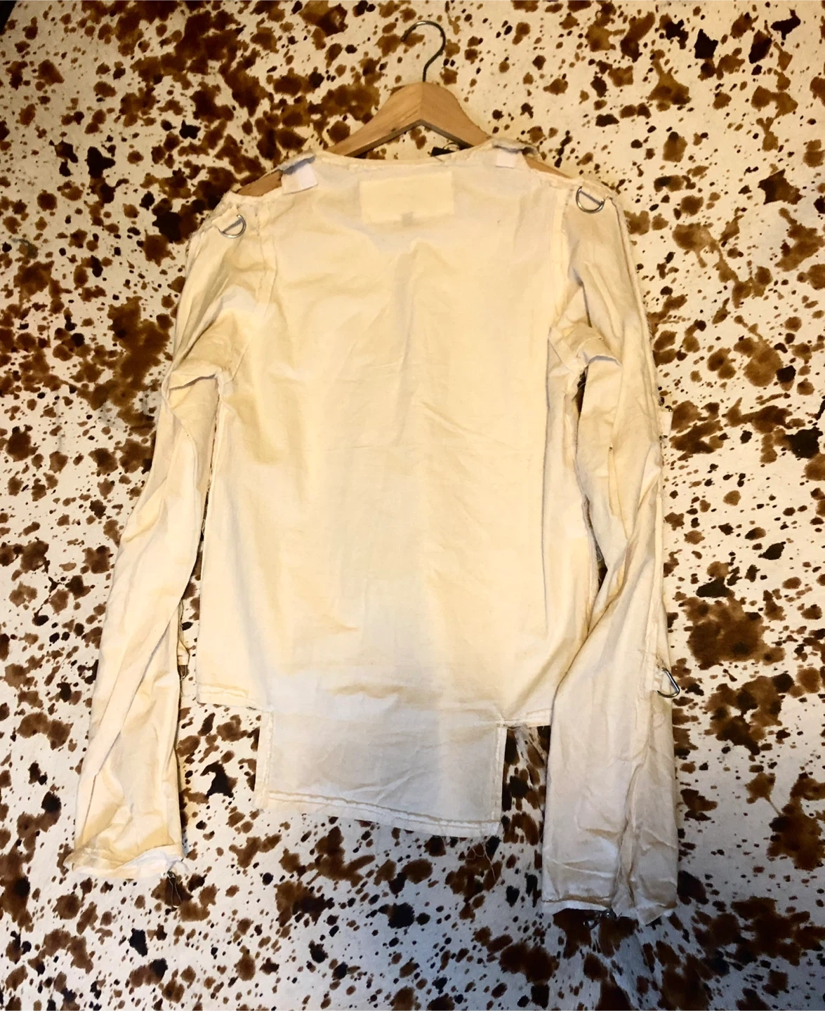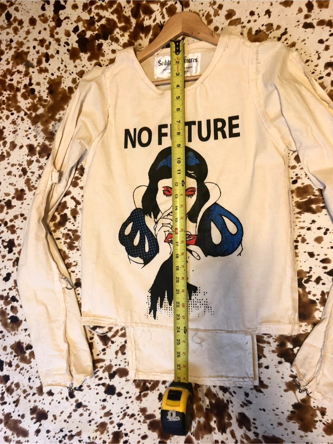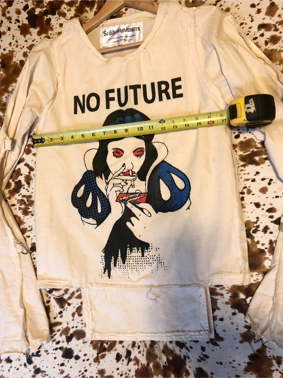 This is a graphic Punk rock bondage long sleeve shirt with a "NO FUTURE" print featuring Snow White. It's a unique piece with distressed details and metal D ring accents on the shoulders and sleeves. The material appears to be cotton.