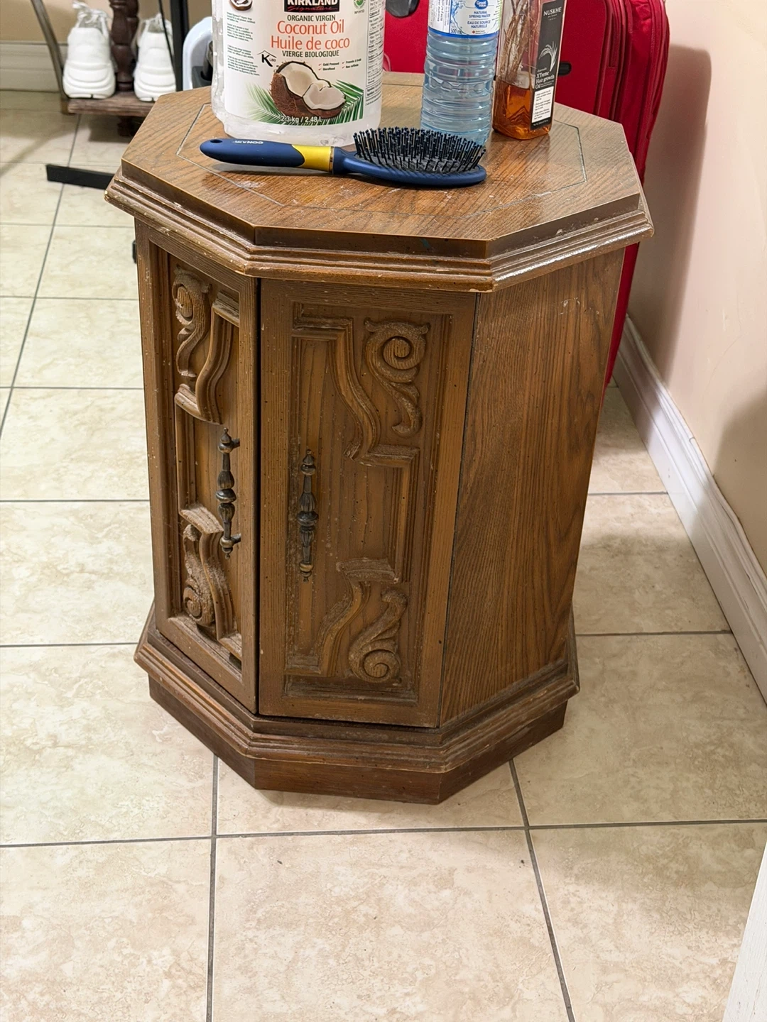 This is a vintage wooden octagonal side table with ornate detailing. It features a cabinet door with a decorative handle. The wood is a warm, medium-brown tone.