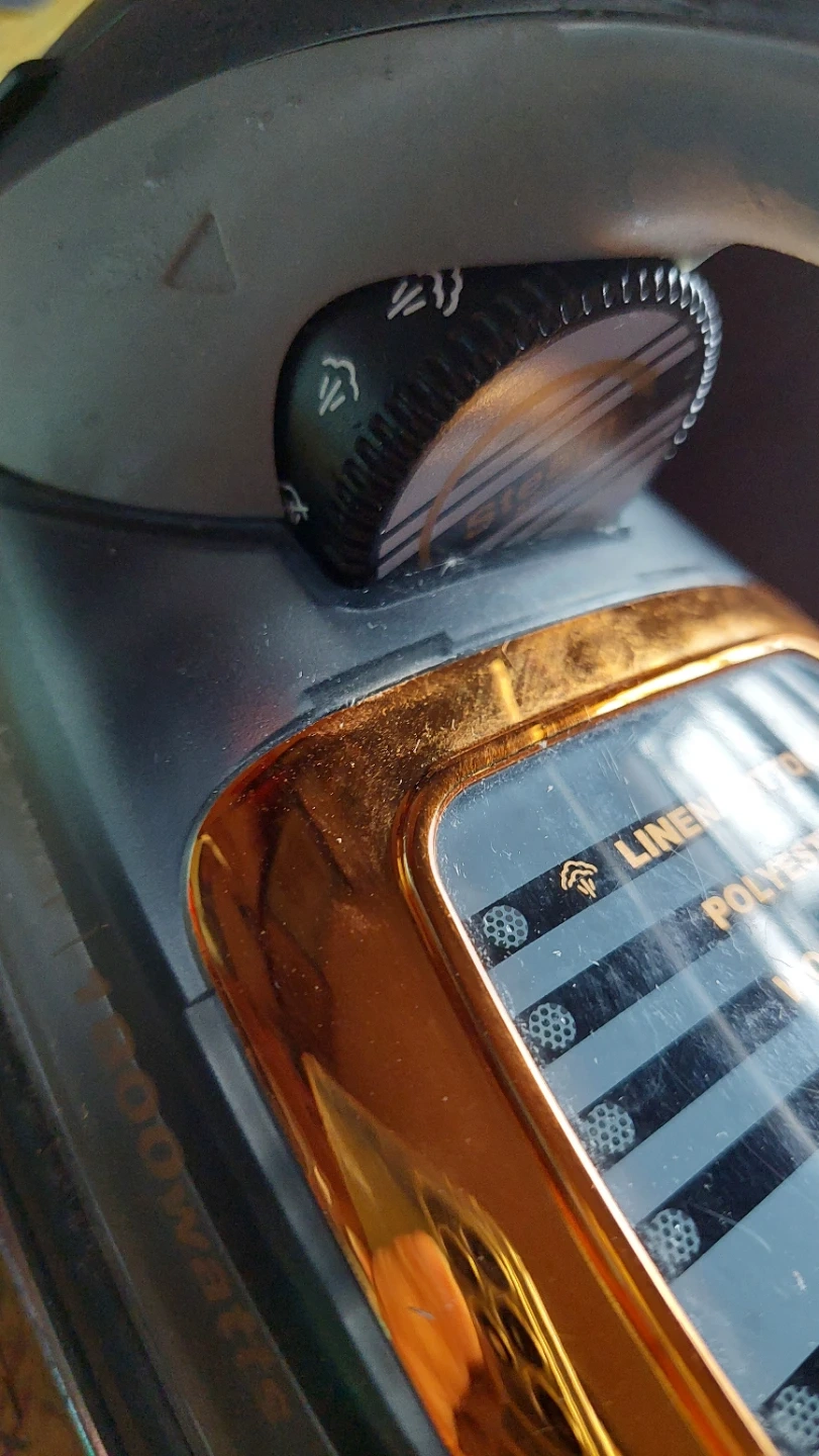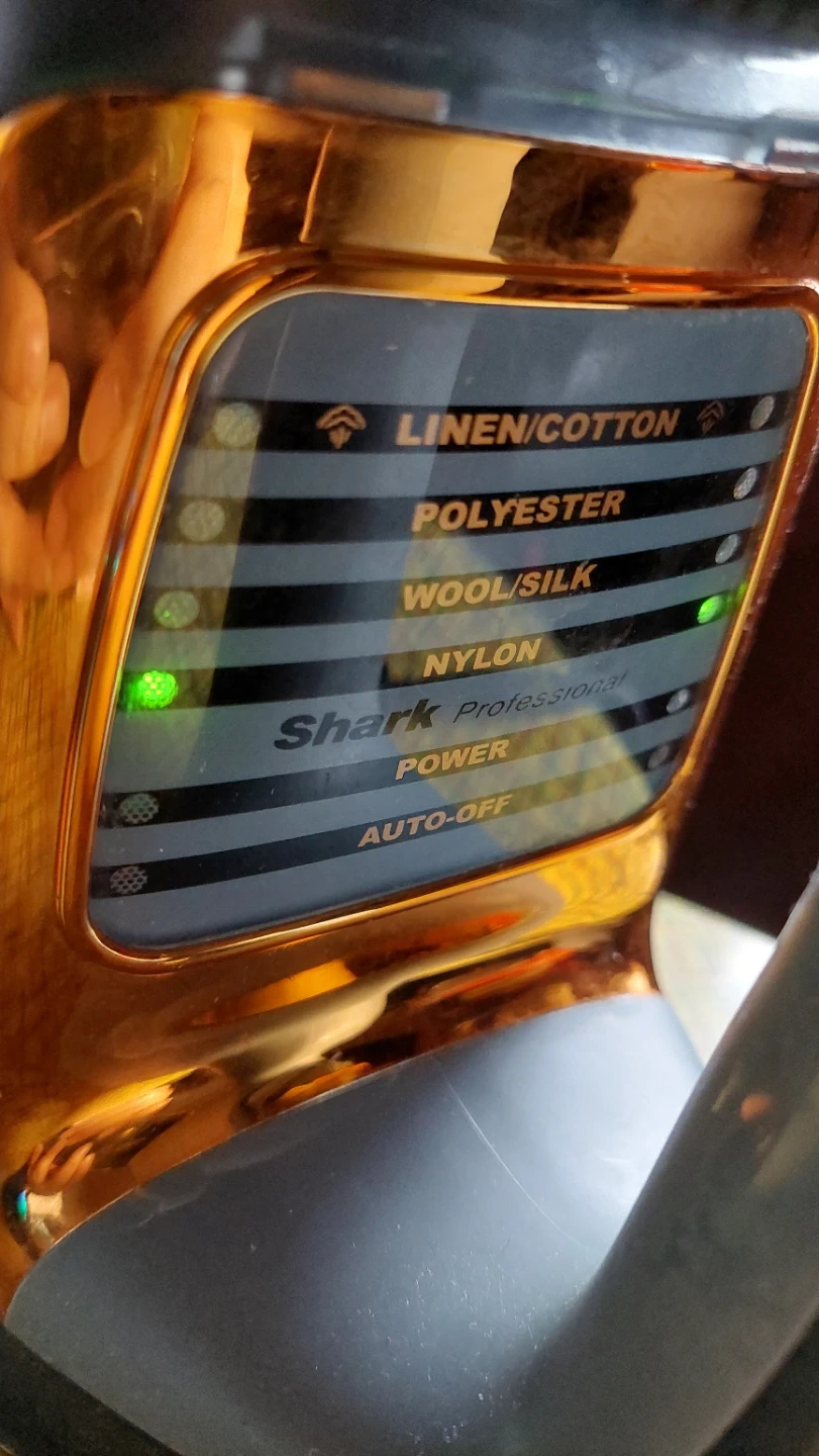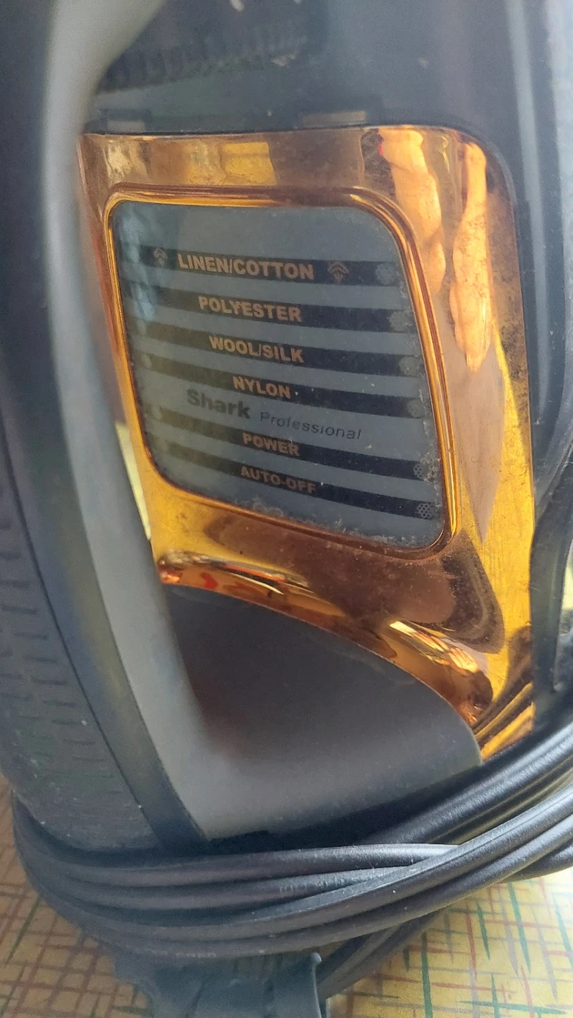 Working, well loved, Shark Professional steam iron with "Smooth Glide Technology". It has settings for Linen/Cotton, Polyester, Wool/Silk, and Nylon. Features auto-shut off power settings, self cleaning, vertical steam, steam burst function, non-stick, anti-drip, adjustable temp control.