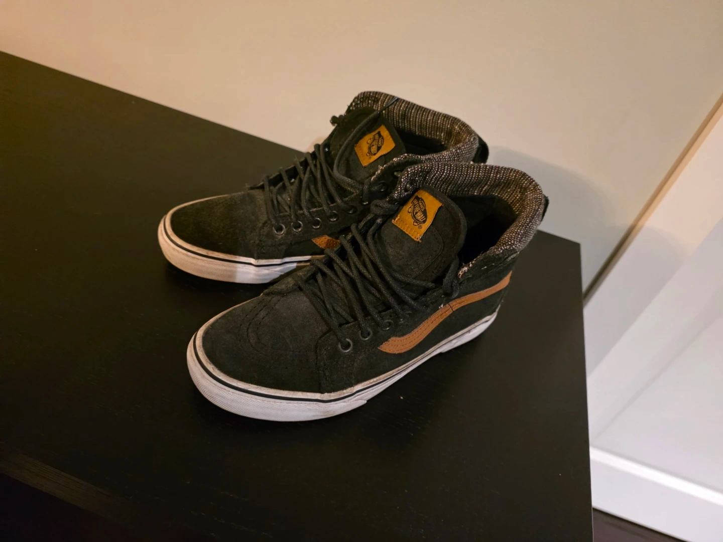 These are black Vans high-top sneakers with a brown stripe detail. They're a women's size 7.5, with a US Men's size 6.0 equivalent.