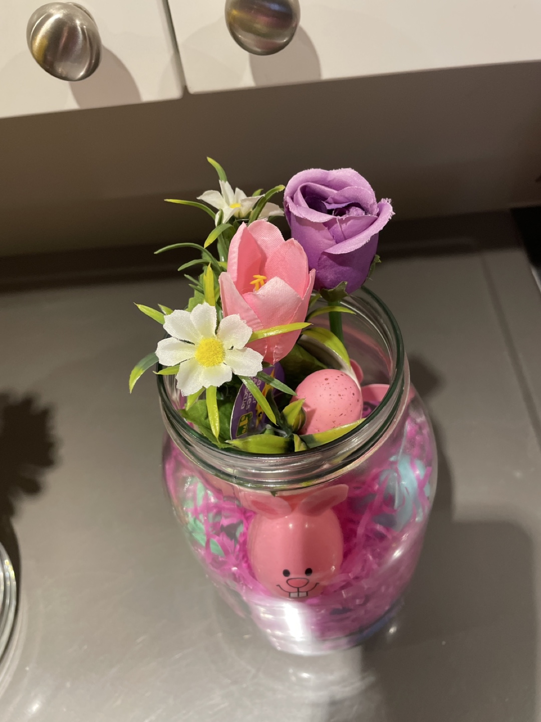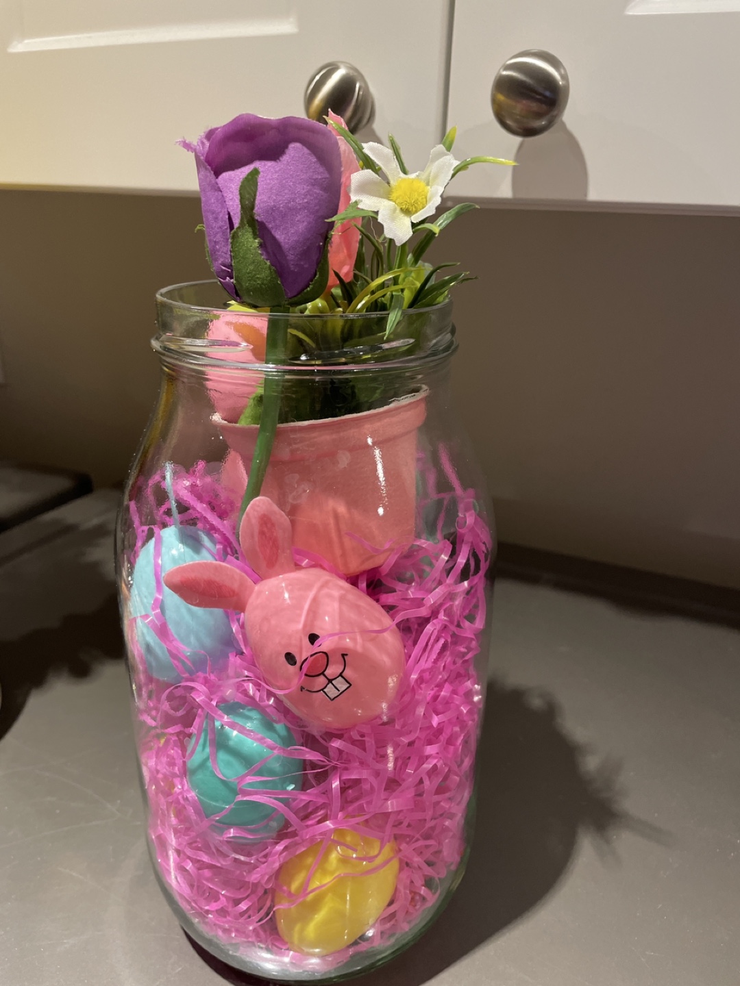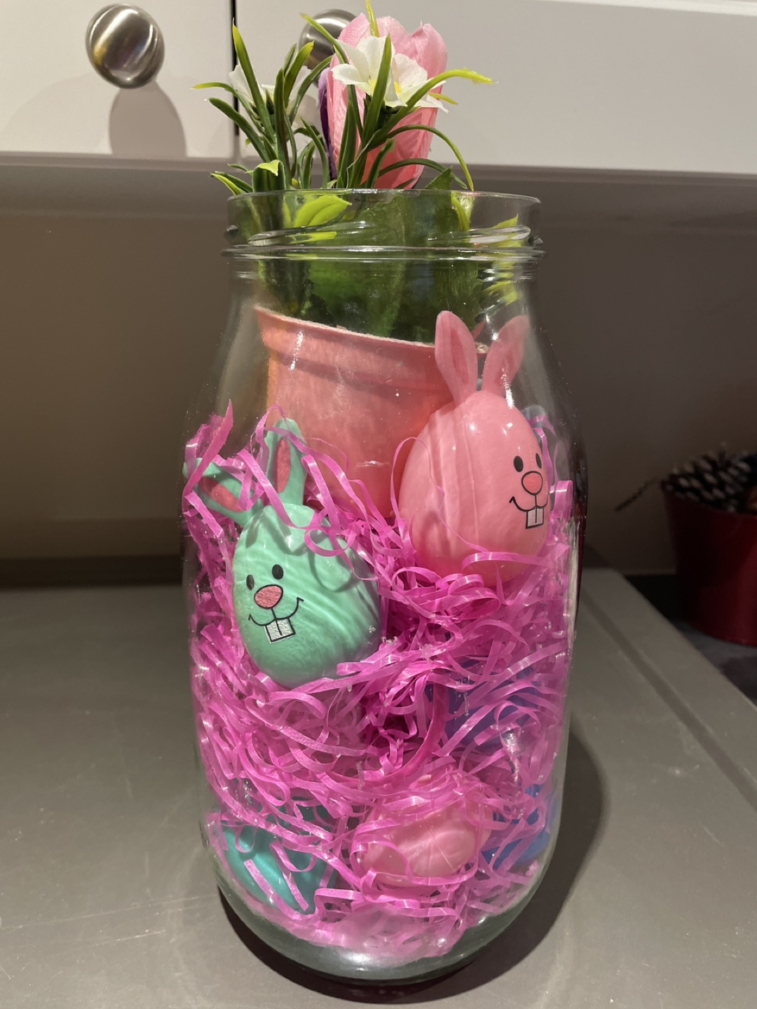 Adorable Easter decoration. Glass jar filled with pink shredded paper, pastel eggs, and bunny-shaped eggs. Artificial flowers added for a touch of spring. Perfect for Easter tablescape.