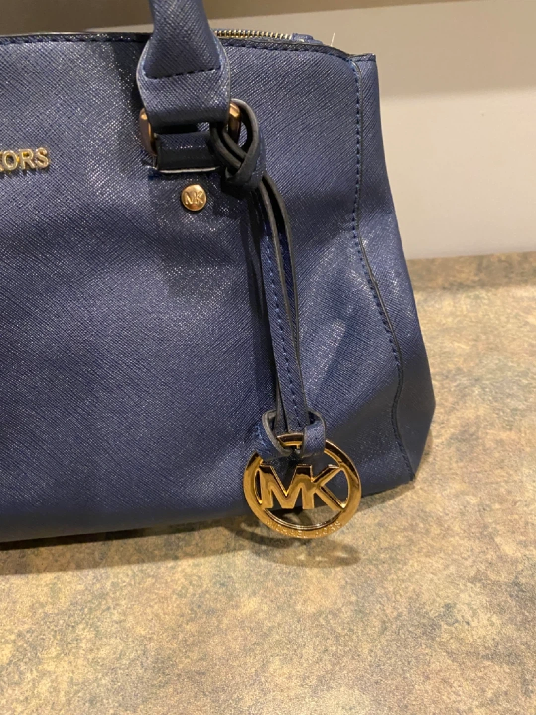 This Michael Kors satchel handbag is made of navy blue Saffiano leather. It features gold-tone hardware and a top zip closure. The bag has a hangtag with the MK logo.
