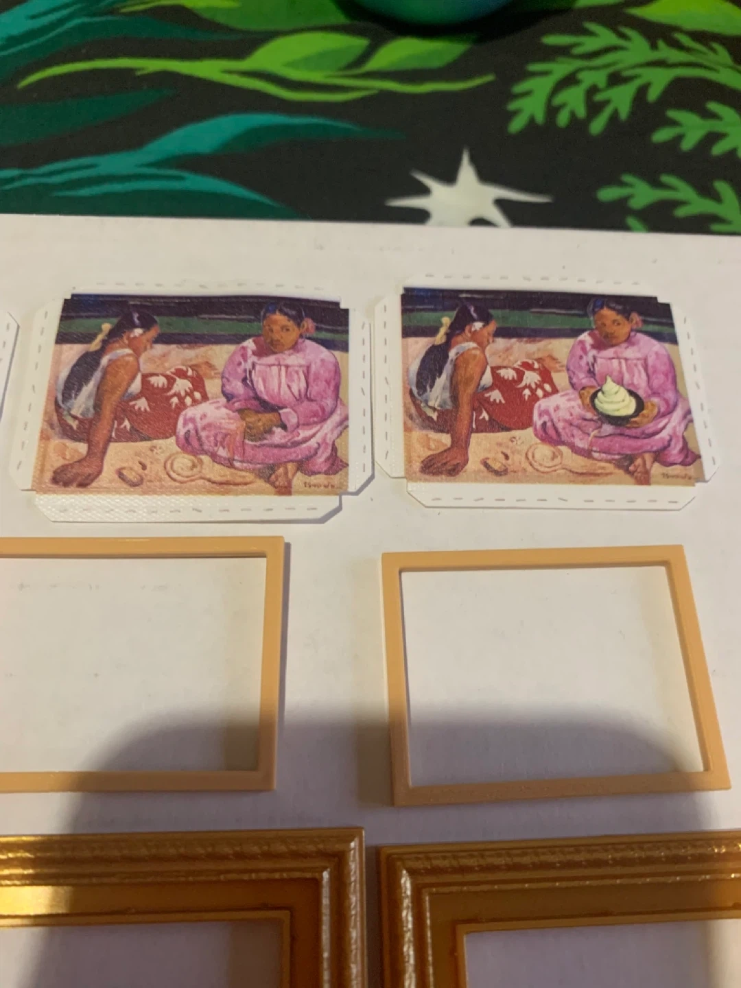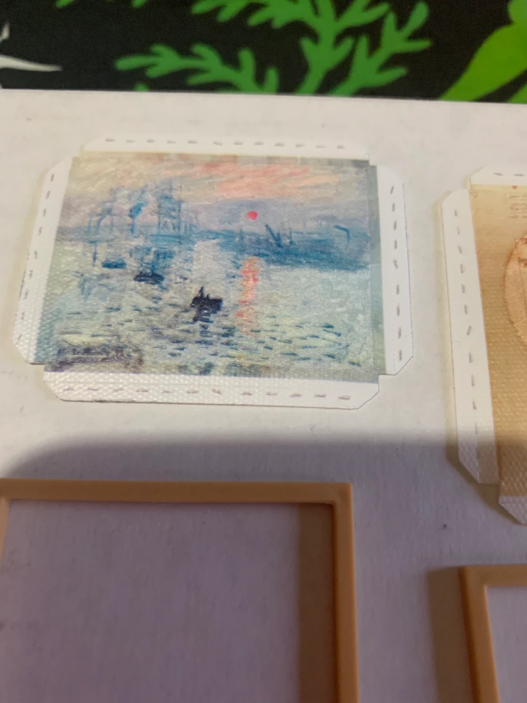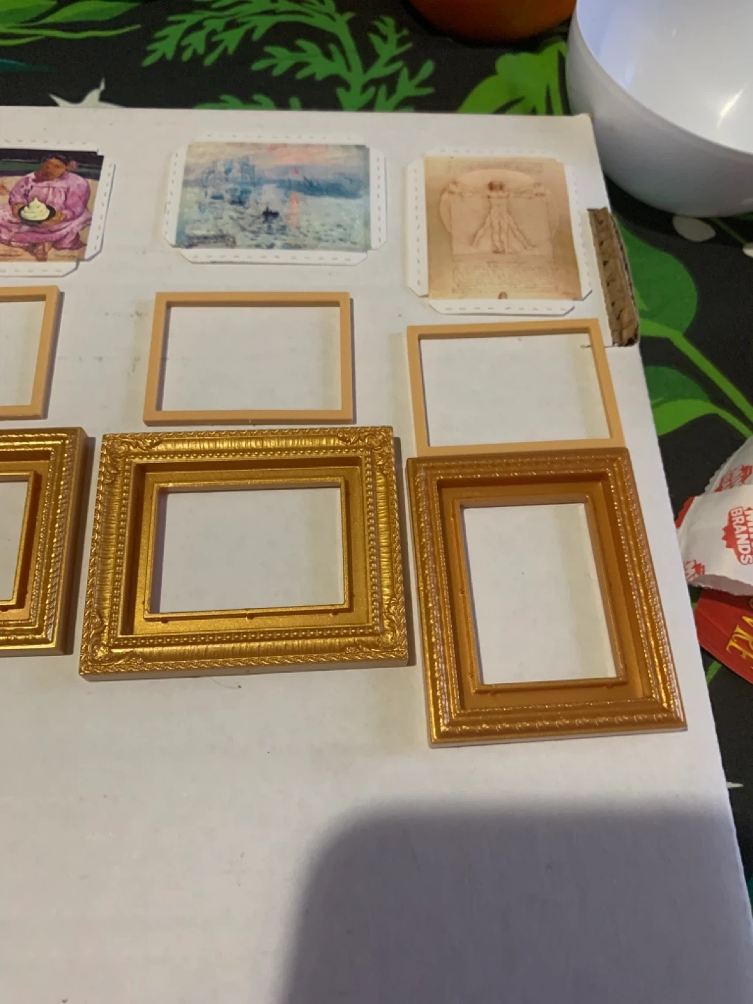 Set of miniature art prints featuring famous artworks. Includes a variety of decorative frames. Perfect for dollhouses or miniature displays!
