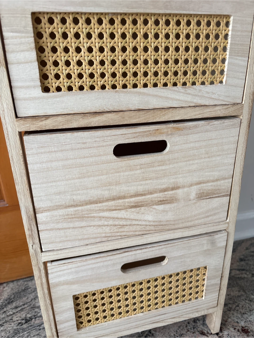 This wooden storage cabinet features three drawers, two of which have cane fronts. It's a great piece for organizing small items. Made of wood with a light, bleached finish.