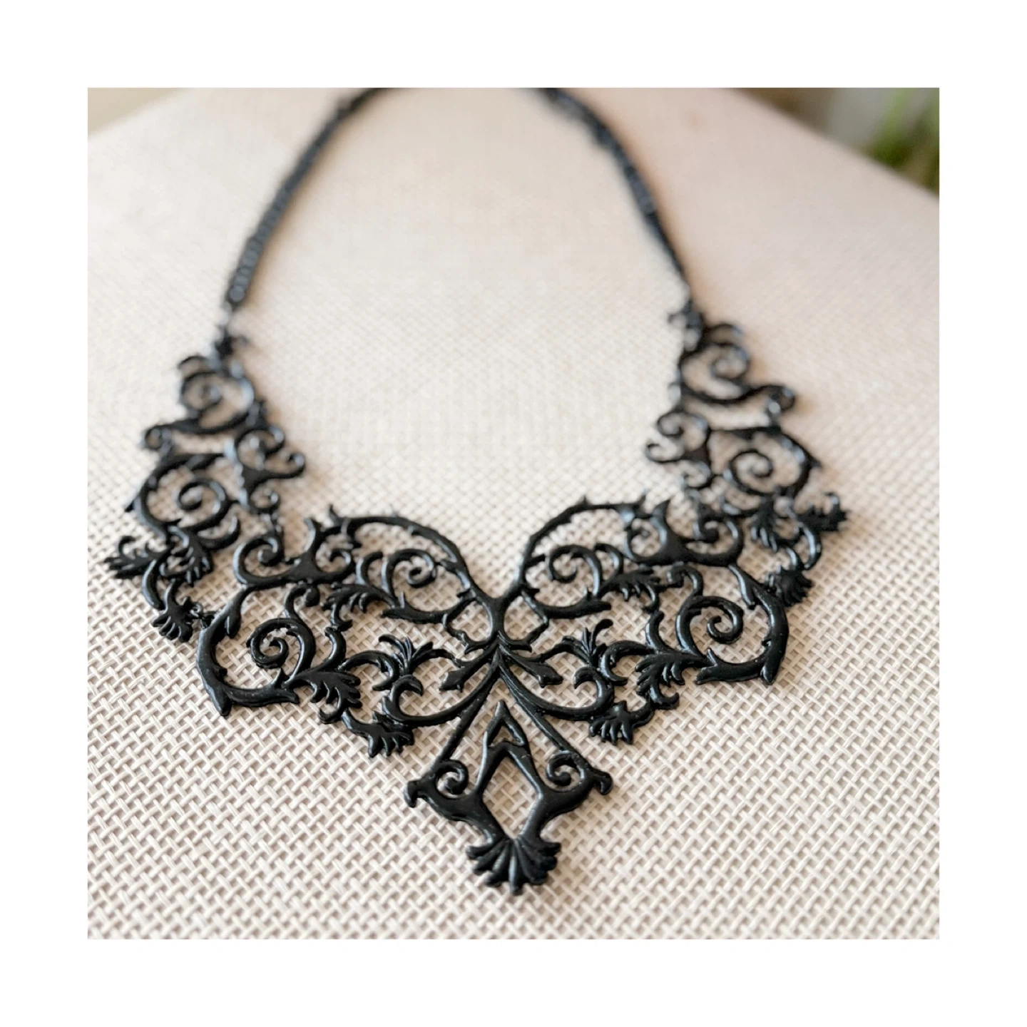 Selling a beautiful black statement necklace. It has an intricate, filigree-like design.