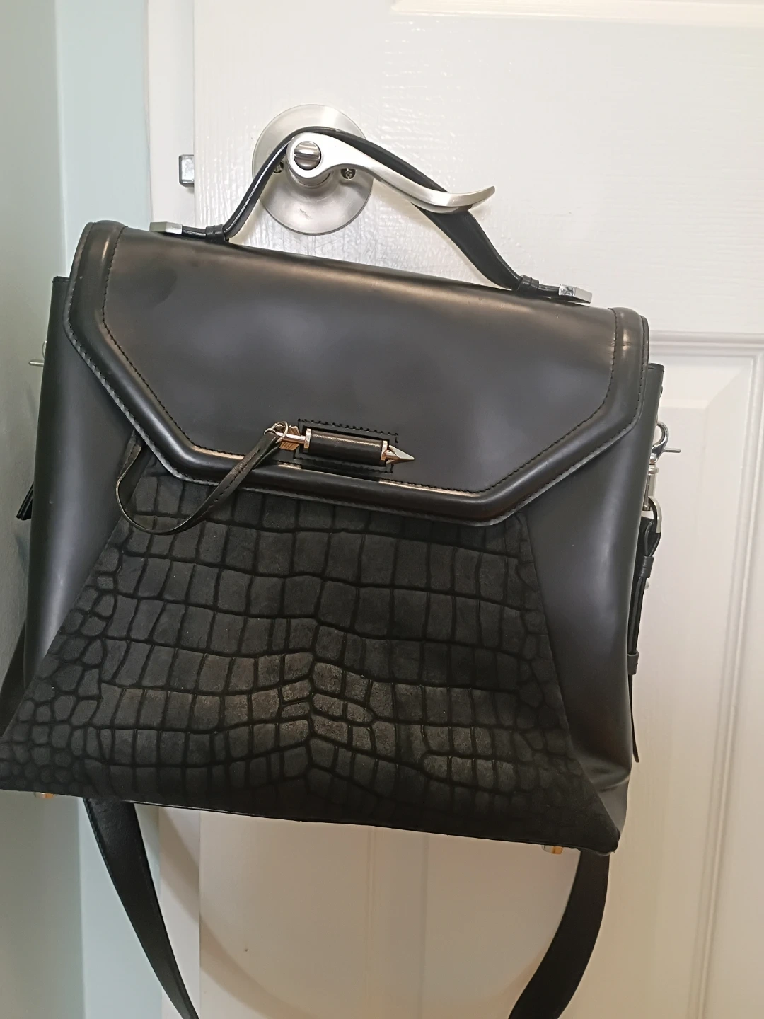 This is a stylish Mackage handbag, made from a combination of smooth black leather and textured suede. It's a versatile accessory that can be carried by the top handle or with the detachable shoulder strap. The bag features a zippered pocket and a main compartment for your essentials.