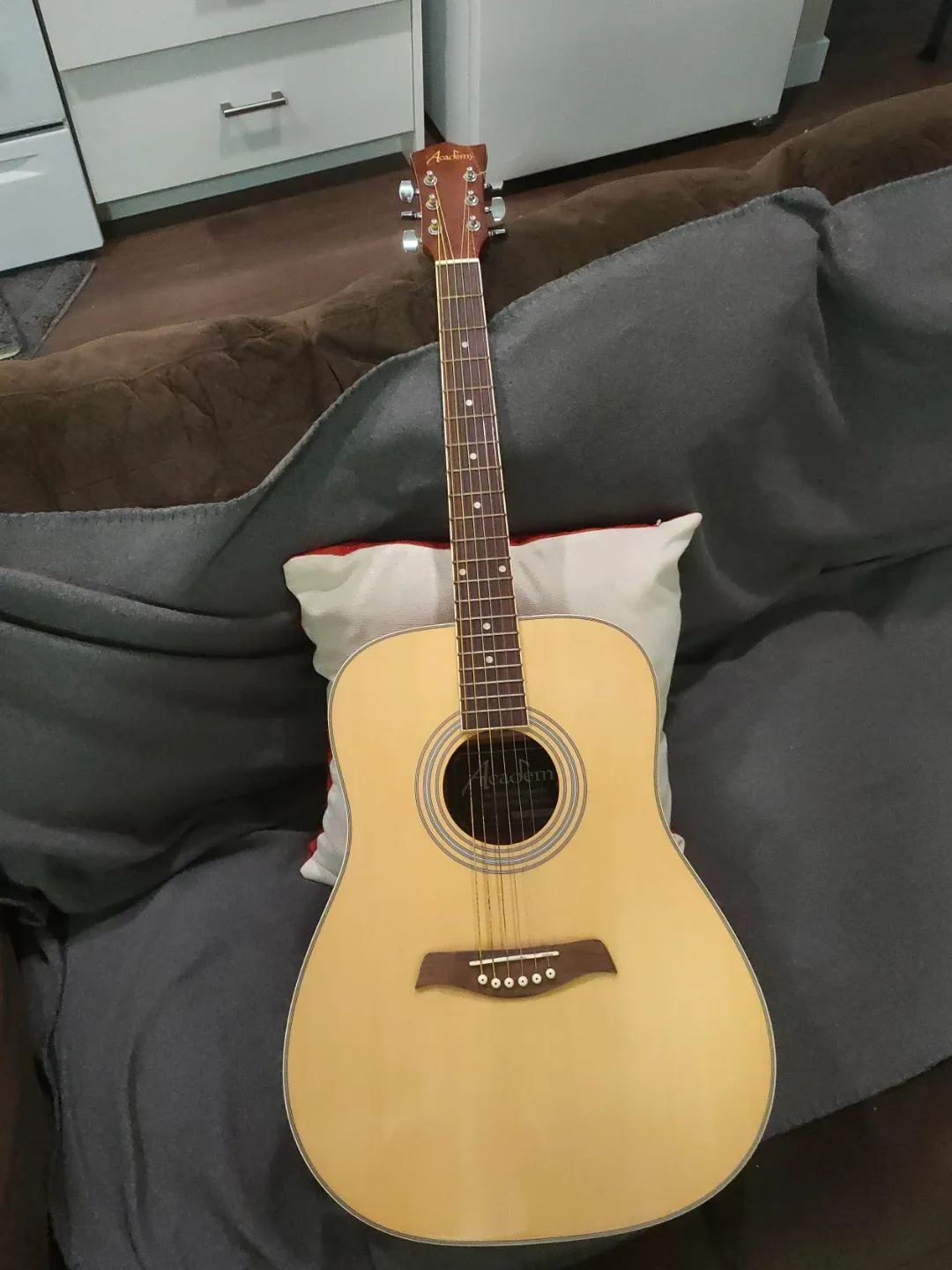 Academy acoustic guitar in a natural wood finish. Six strings with a wooden bridge and fretboard. It's ready for strumming! Have small damage but perfect works great sounds