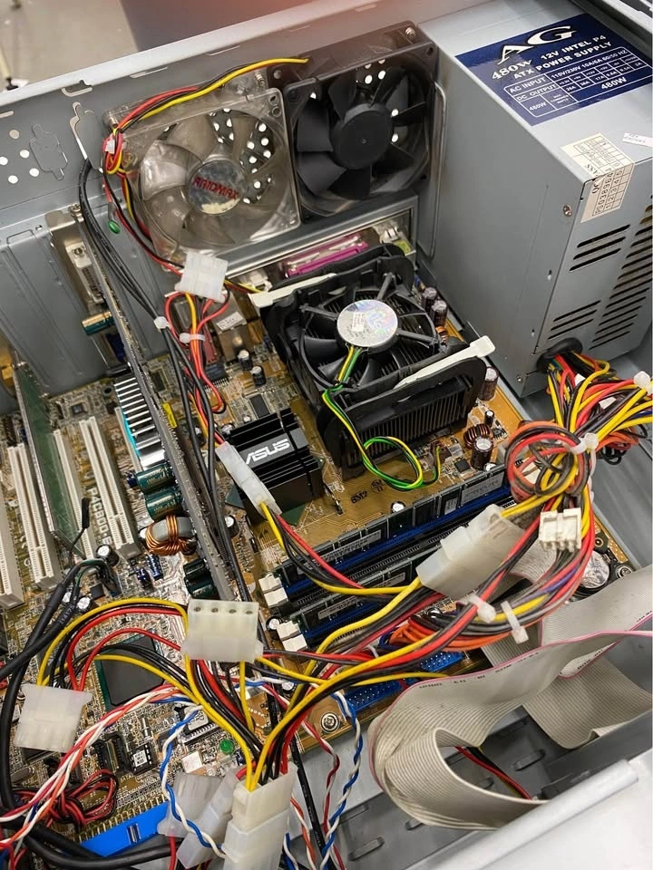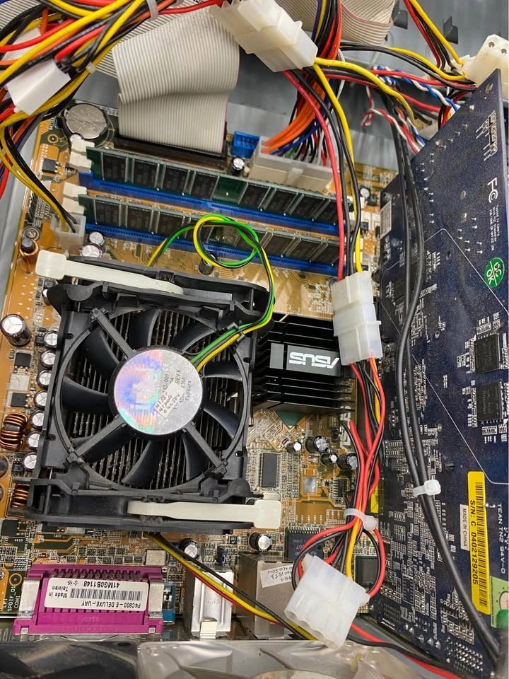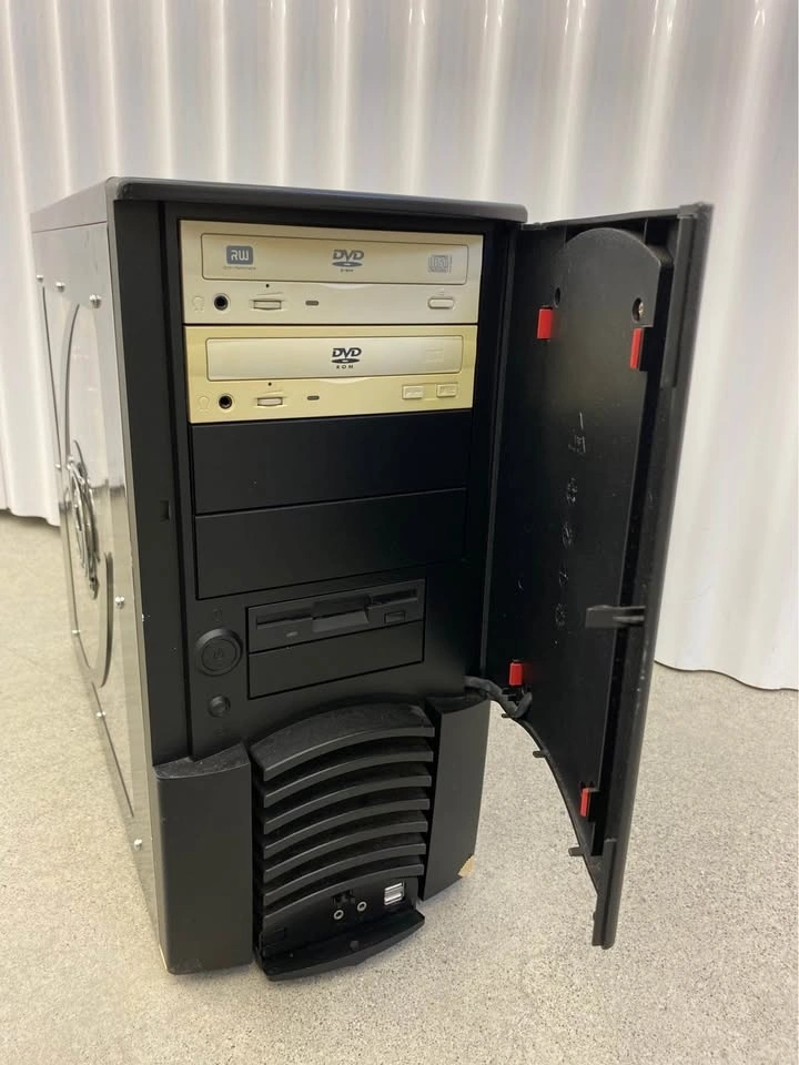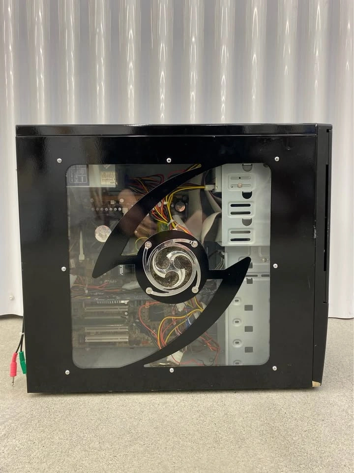Raidmax Scorpio ATX-868WBP model case. Powers on - fans & lights work. No hard drive. Includes Ram and Asus P4C800-E Deluxe motherboard. Sold as is for parts.
