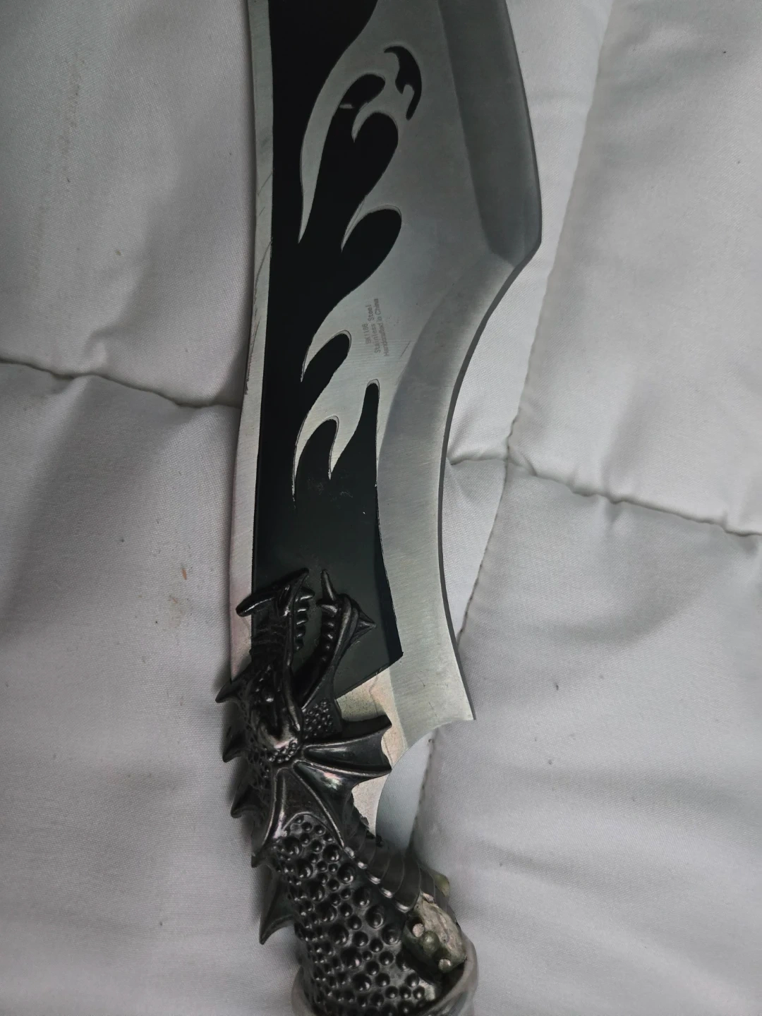 This knife features a unique dragon head handle design with a stainless steel blade. It has a curved blade with flame-like detailing. Its distinctive handle has a mesh-like texture and silver-tone accents.