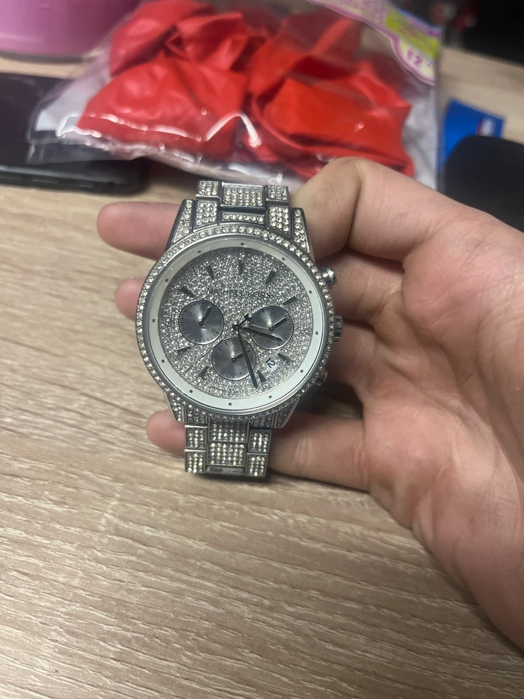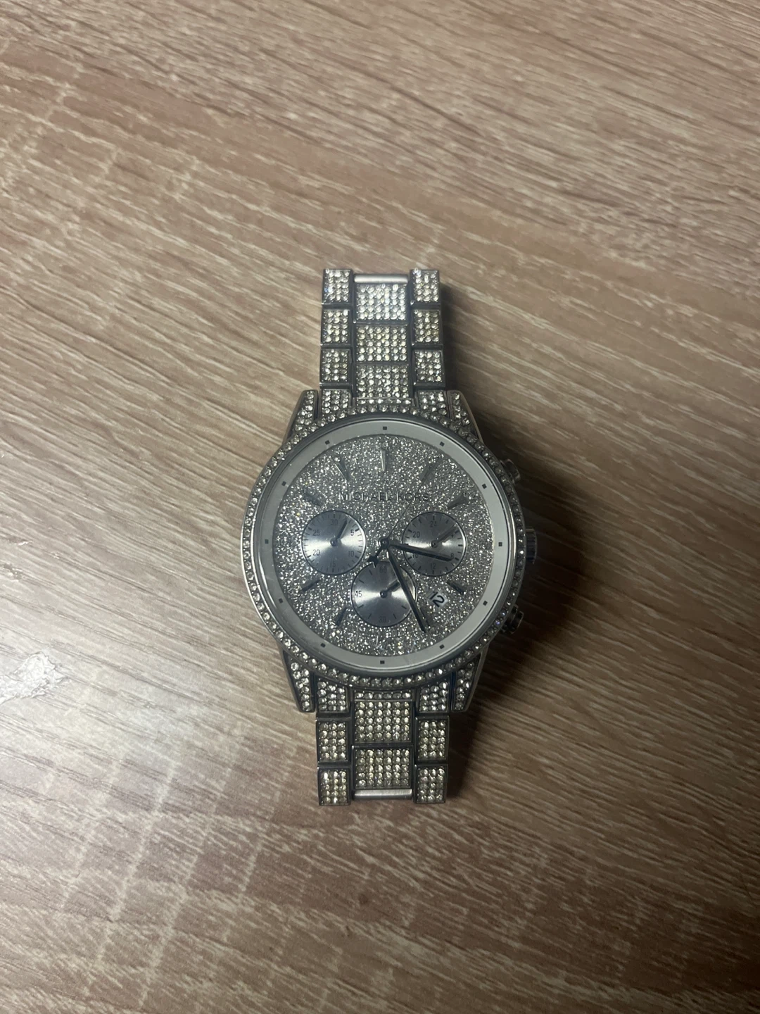 Sparkly silver Michael Kors watch with three subdials. It's a bold statement piece that catches the light beautifully. This watch looks great for everyday wear or for dressing up!