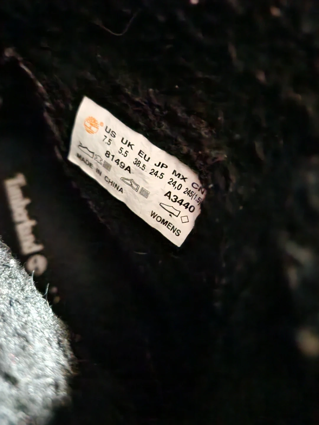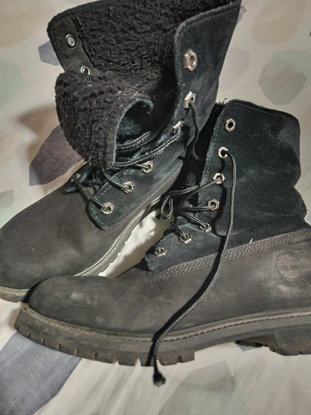 Black suede Timberland boots with a fluffy interior lining. These boots feature a lace-up front and are a women's size 7.5. They're great for cooler weather!
