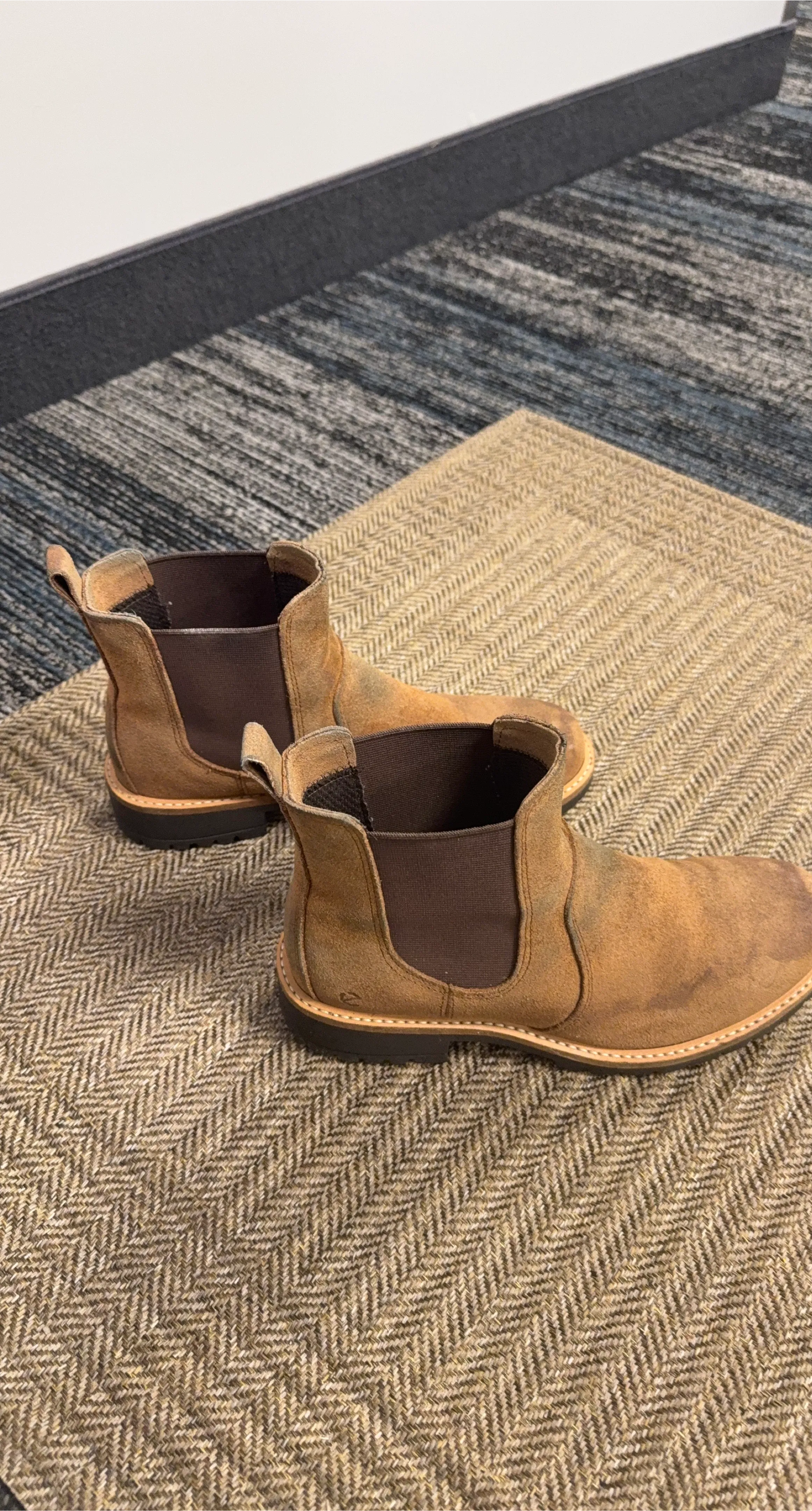 These are brown suede Chelsea boots. They feature elastic side panels for an easy slip-on fit. The boots have a durable sole and a classic Chelsea boot silhouette. They're suitable for everyday wear. Original from ECCO bought for 150$