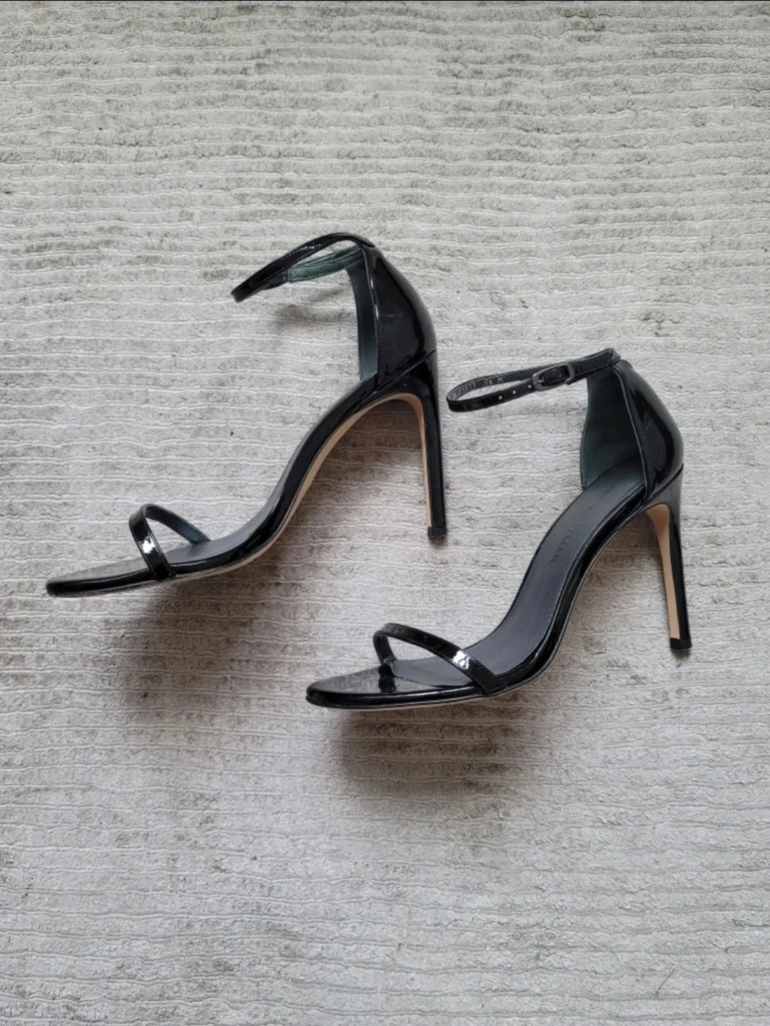 These are black patent leather ankle strap heels from Stuart Weitzman. They feature a slim stiletto heel and a delicate strap design. The material is patent leather.