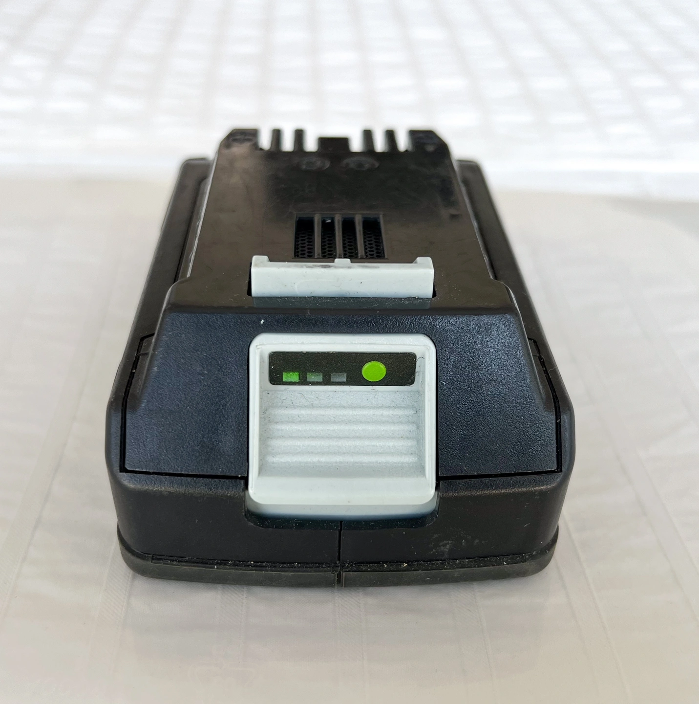 The battery appears to be in normal working order. When the green status button is pushed, the first charge indicator bar lights up (see last photo in set). A recent test with a multimeter showed a reading of 21.12V, which puts it squarely into the 'normal' operating voltage.