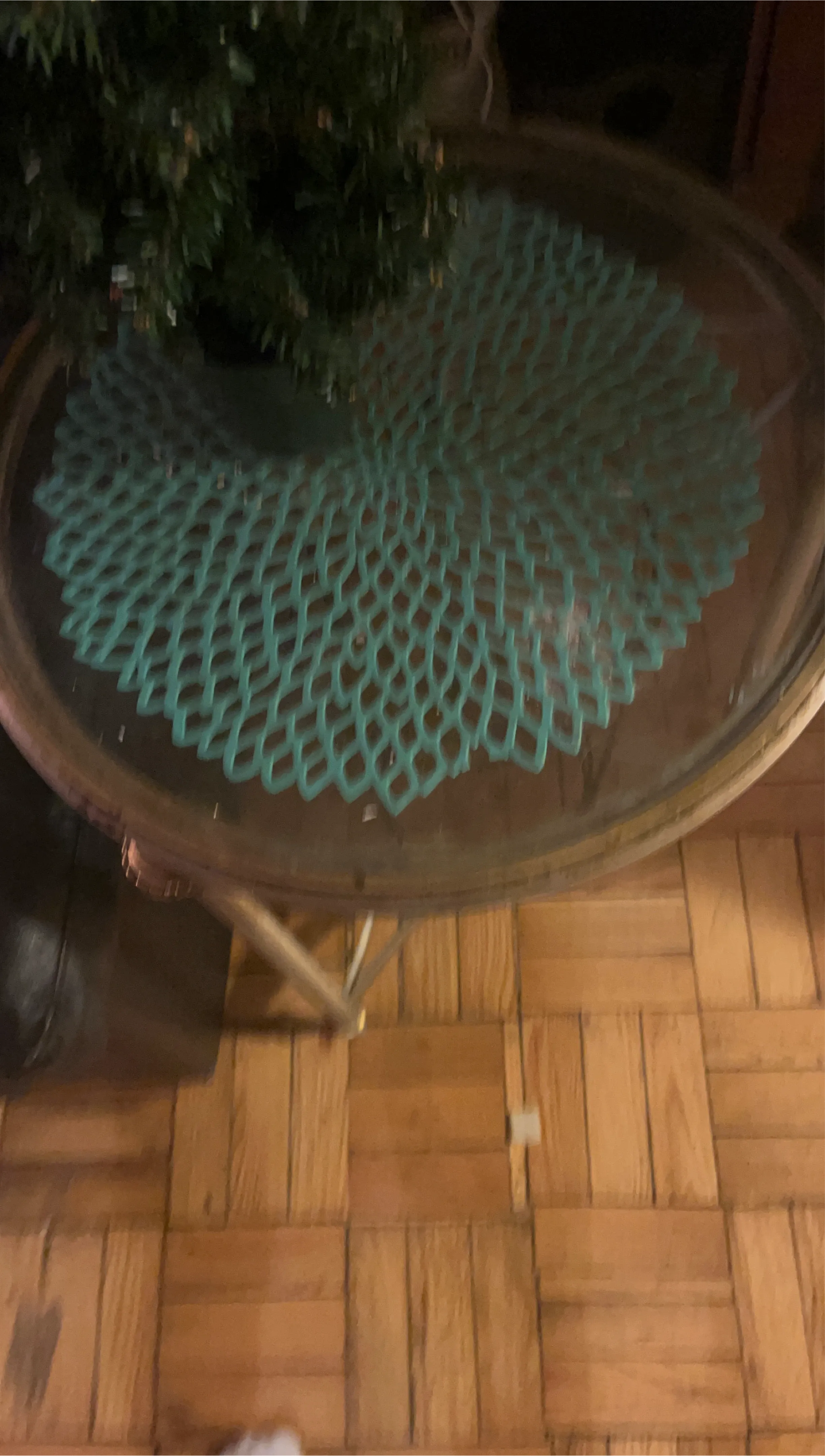 This is a round glass top side table. It has a metal frame and legs. A teal placemat is shown on top for display. It's a neat little table for a living room or bedroom.