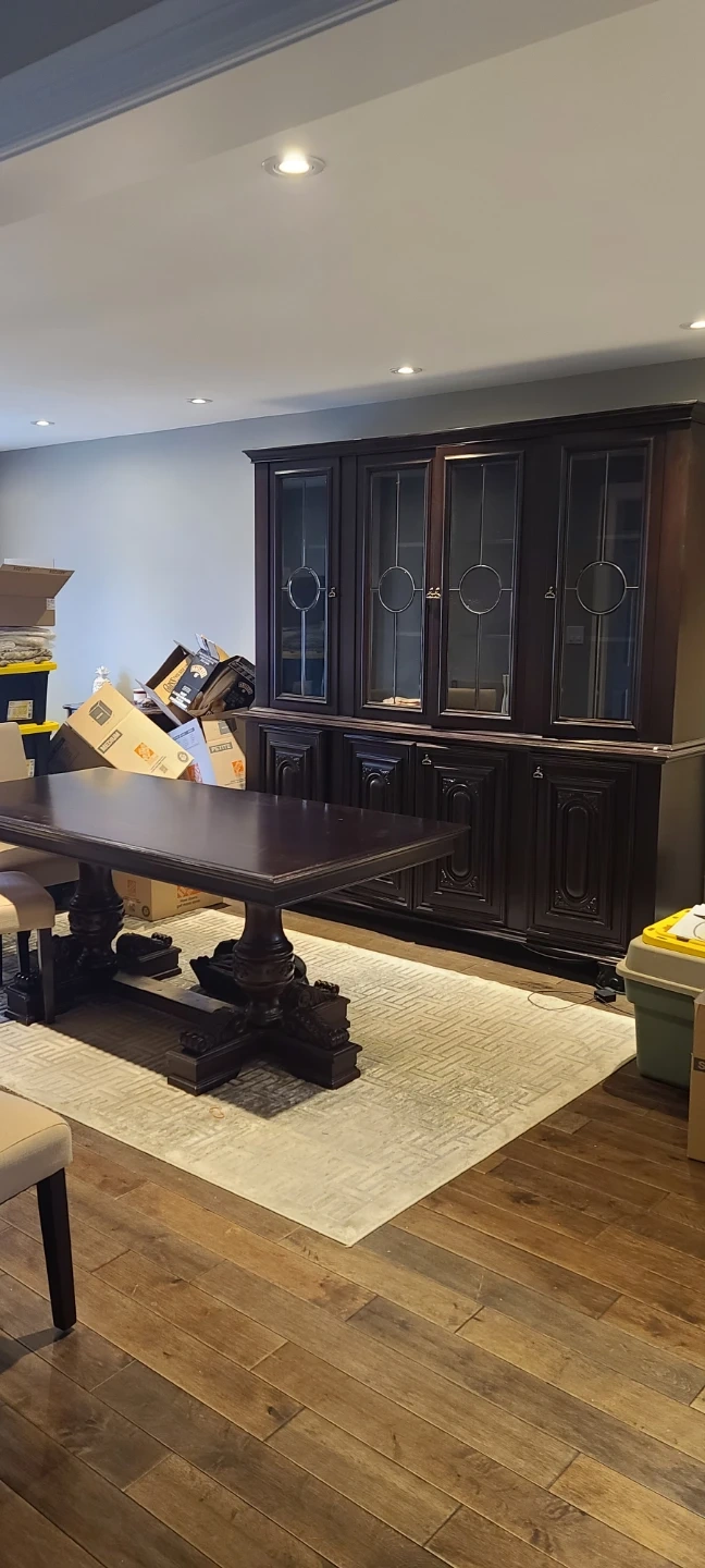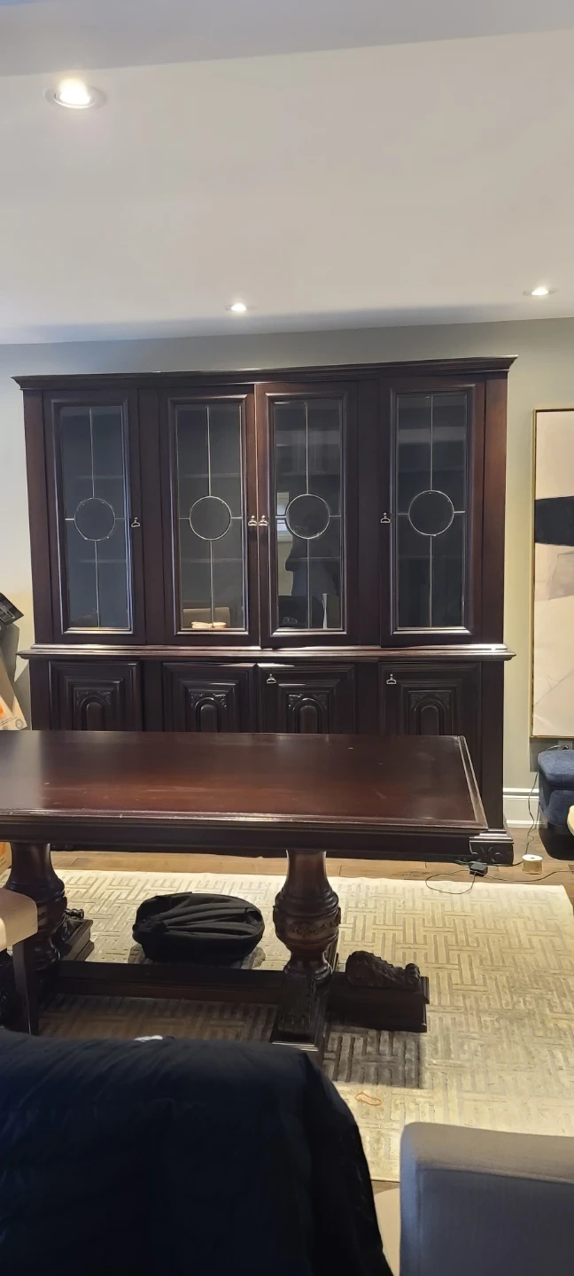 Beautiful dark wood china cabinet with glass doors and dining table It has four glass-fronted cabinets on top and four solid wood cabinets below. It's 2 pieces This piece offers plenty of storage and display space for your dining room. Mahogany wood small defect 2 lower cabinets don't 3 ft wide 2 1/2 ft high 6.4ft long cabinet 7.5ft long 7.3 ft high