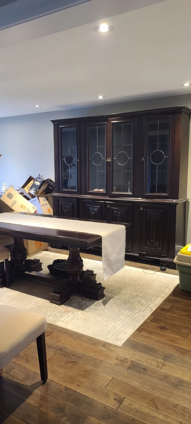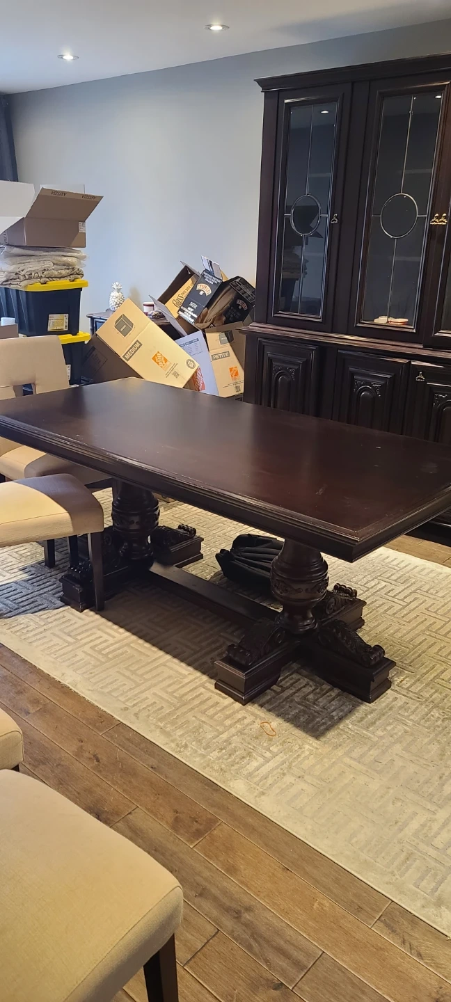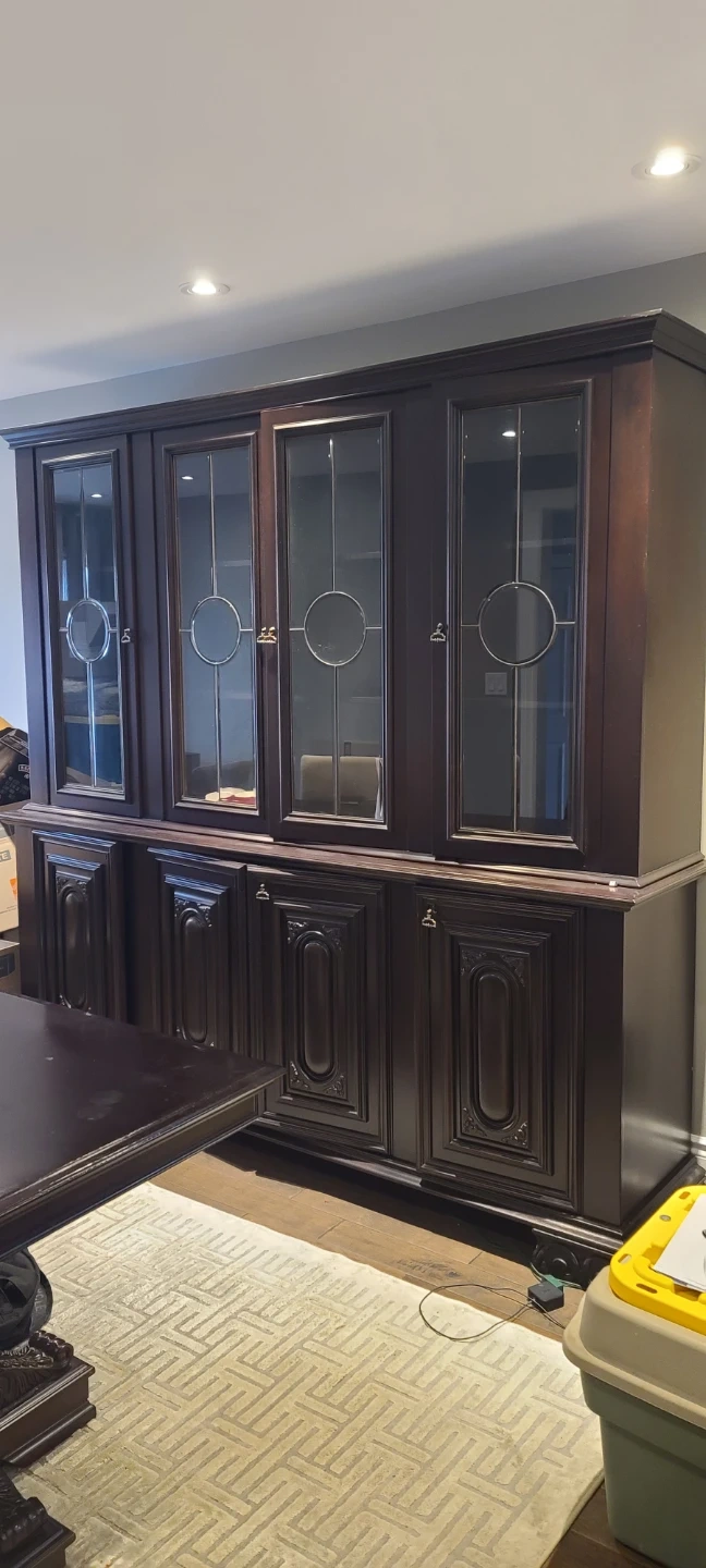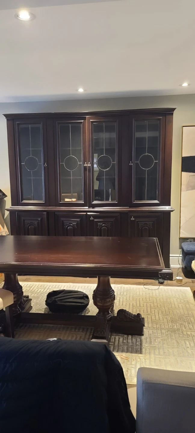 Beautiful dark wood china cabinet with glass doors and dining table It has four glass-fronted cabinets on top and four solid wood cabinets below. It's 2 pieces This piece offers plenty of storage and display space for your dining room. Mahogany wood small defect 2 lower cabinets don't 3 ft wide 2 1/2 ft high 6.4ft long cabinet 7.5ft long 7.3 ft high