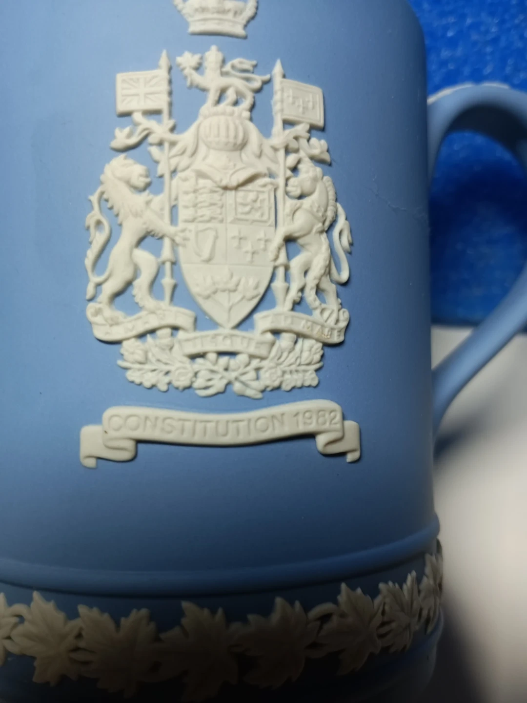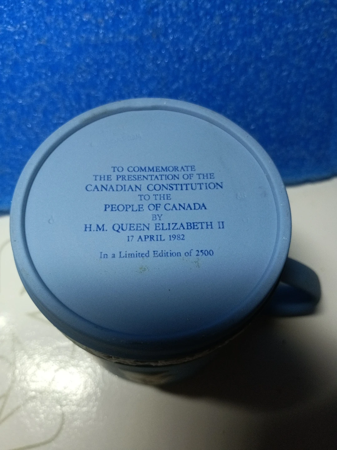 This is a Wedgwood Jasperware mug commemorating the Canadian Constitution in 1982. It features a profile of Queen Elizabeth II and the Canadian Coat of Arms. Made of fine stoneware.