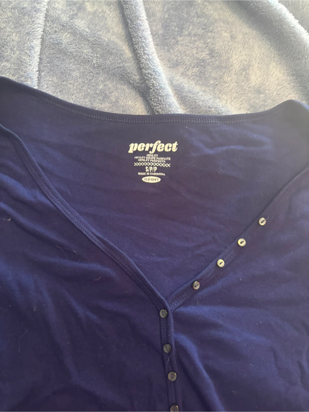 This is a blue Henley shirt from Old Navy. It's a size S/P. The shirt has a V-neck with button closure and a lettuce hem.