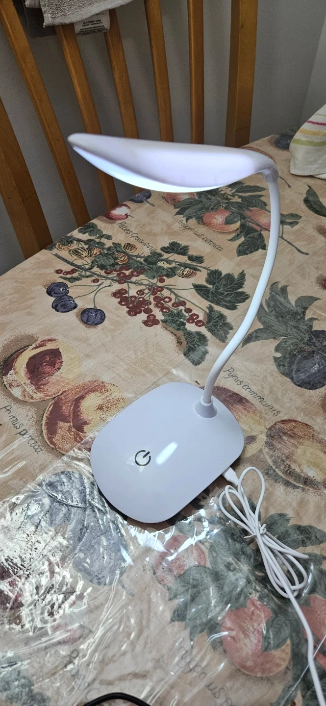 This is a white LED desk lamp with a flexible gooseneck design. It's powered by a USB cable and features a touch-sensitive power button. Its slim profile makes it easy to place on any desk.Has three levels of light beam adjustment.