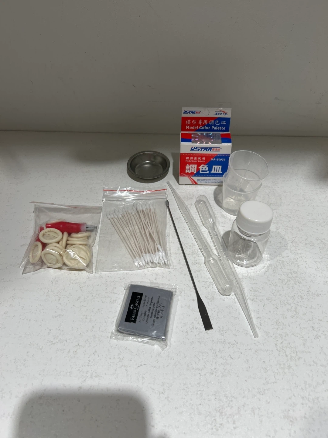 This set includes a USTAR Model Color Palette and a Faber-Castell kneaded eraser. The palette is designed for mixing model paints. It comes with various modelling tools like swabs, droppers, and a small metal palette bowl.