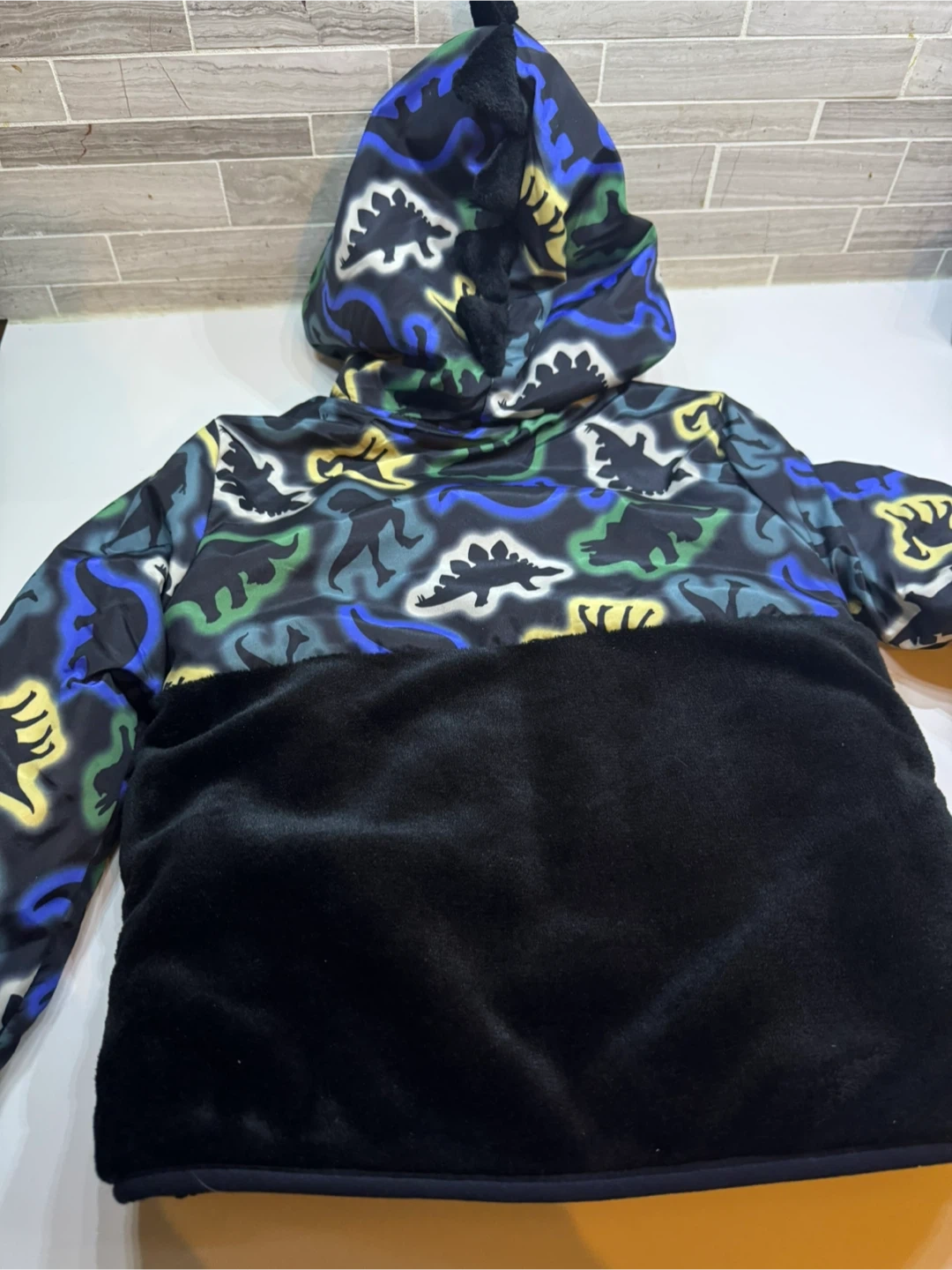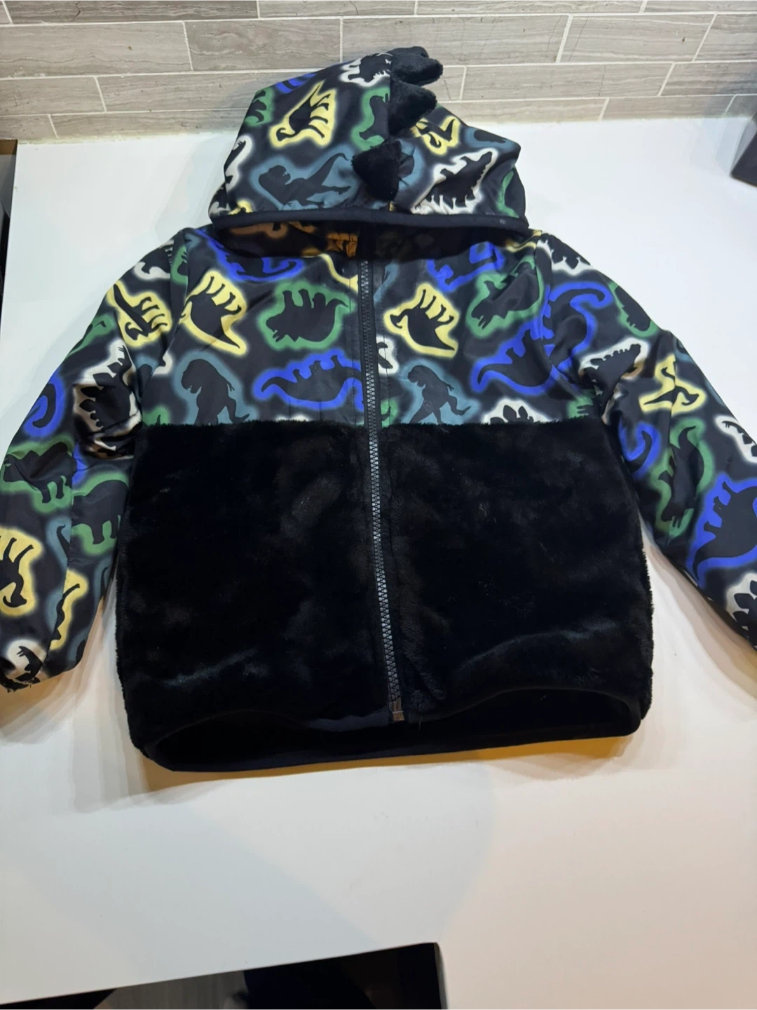 This kids' jacket features a cool dinosaur pattern on the upper part and hood. It has a fuzzy black lower panel and cozy lining. Perfect for keeping little ones warm on chilly days!
