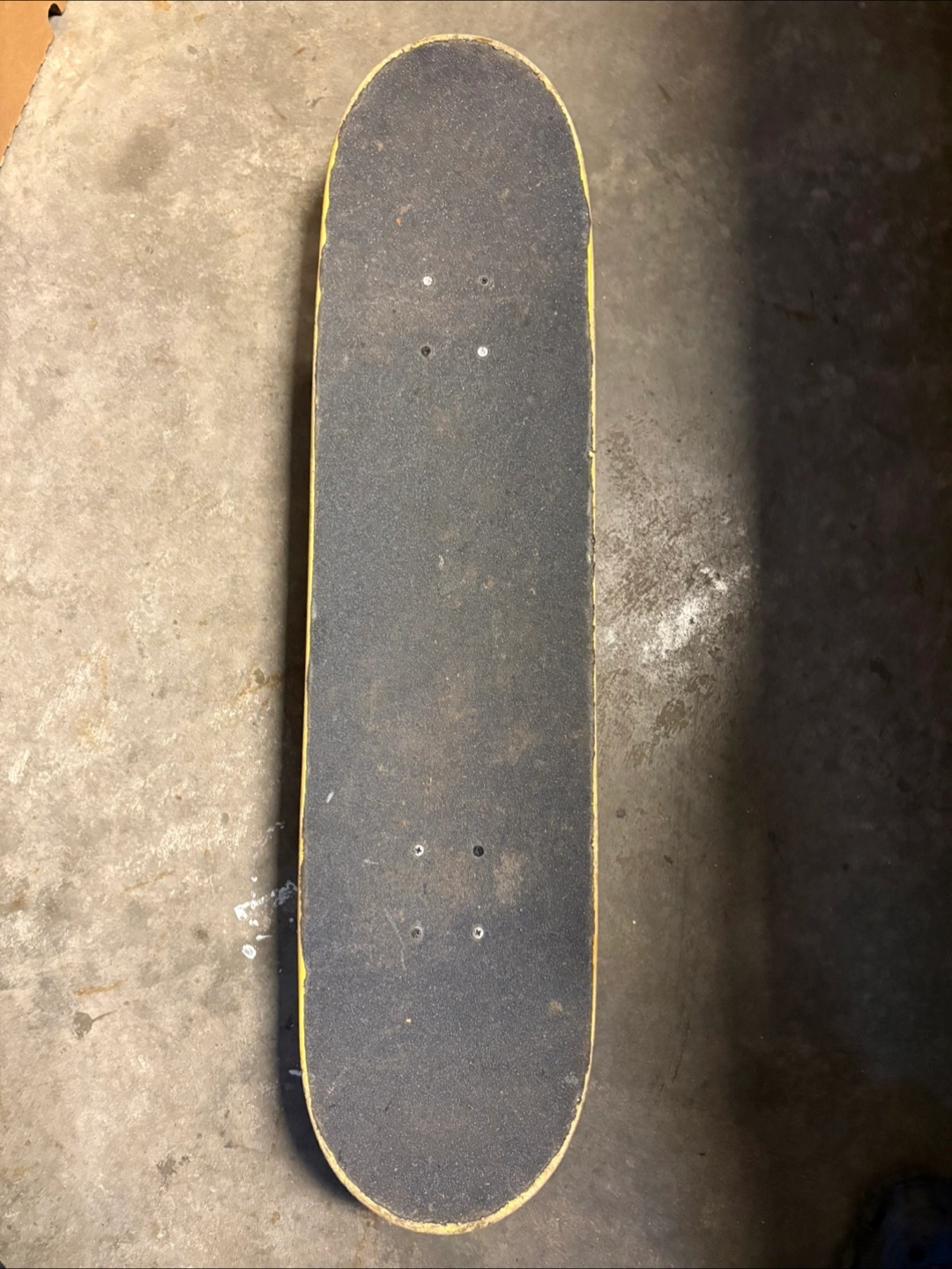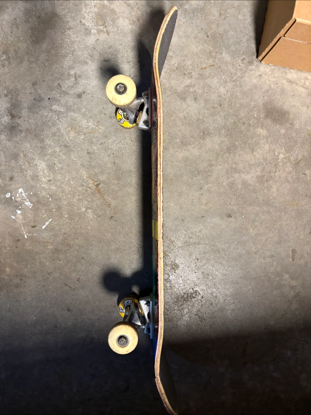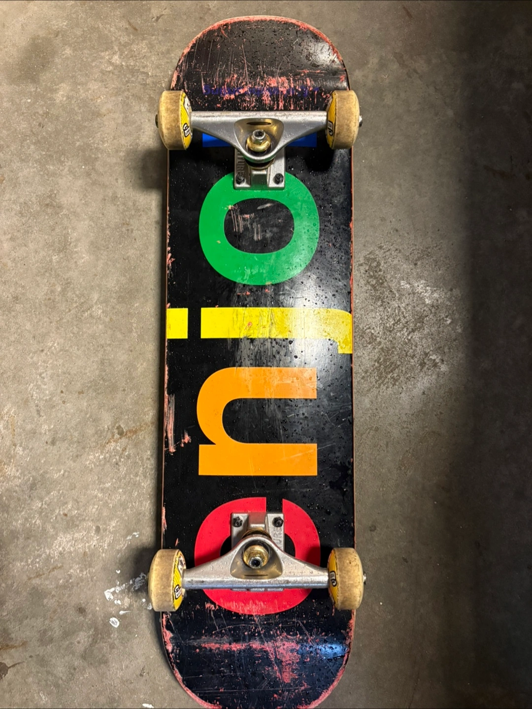 This is a used Enjoi skateboard with colourful lettering on the bottom. It's ready for some cruising or tricks! The deck shows some wear but is still solid.