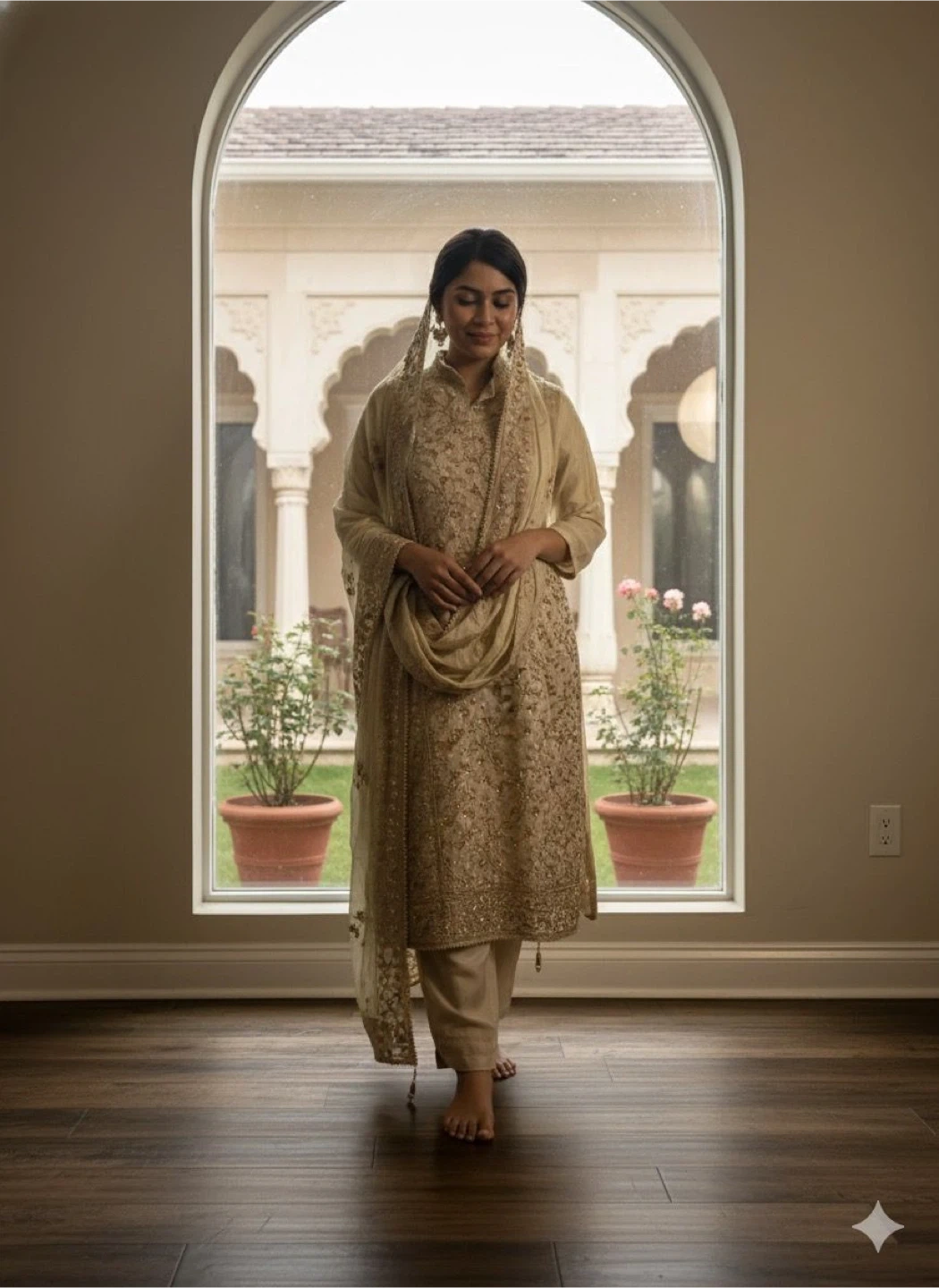 Beautiful gold-toned Salwar Kameez suit with intricate embroidery. Perfect for special occasions or cultural events. The fabric has a lovely sheen and the detailing is exquisite!