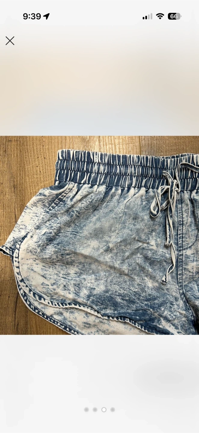 Comfortable dolphin shorts with an acid wash blue and white pattern. Features a drawstring waist and elastic waistband. Material is soft and lightweight, perfect for casual wear or lounging. Size is Medium but fits more like an XS