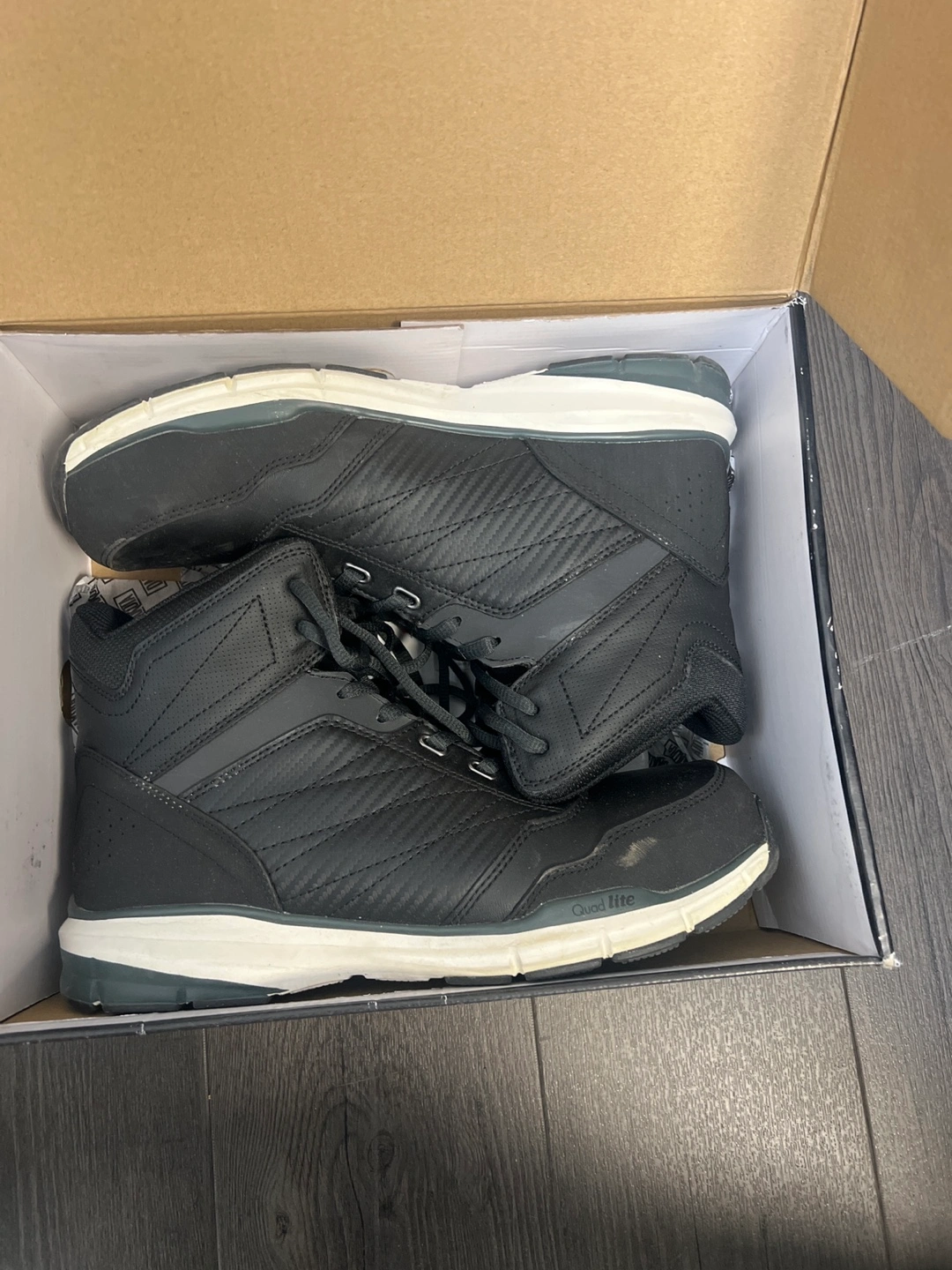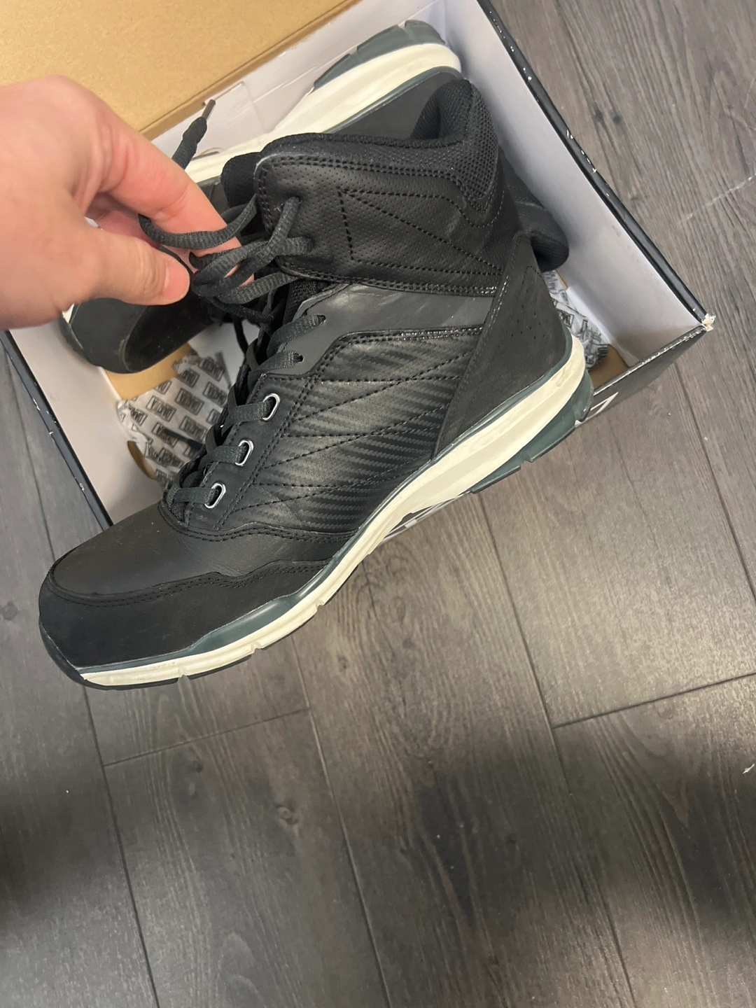 Very lightly used Dakota men's black mid-top steel toe boots. Black leather and textile upper. White sole. Lace-up closure. Comes in original box and extra lace