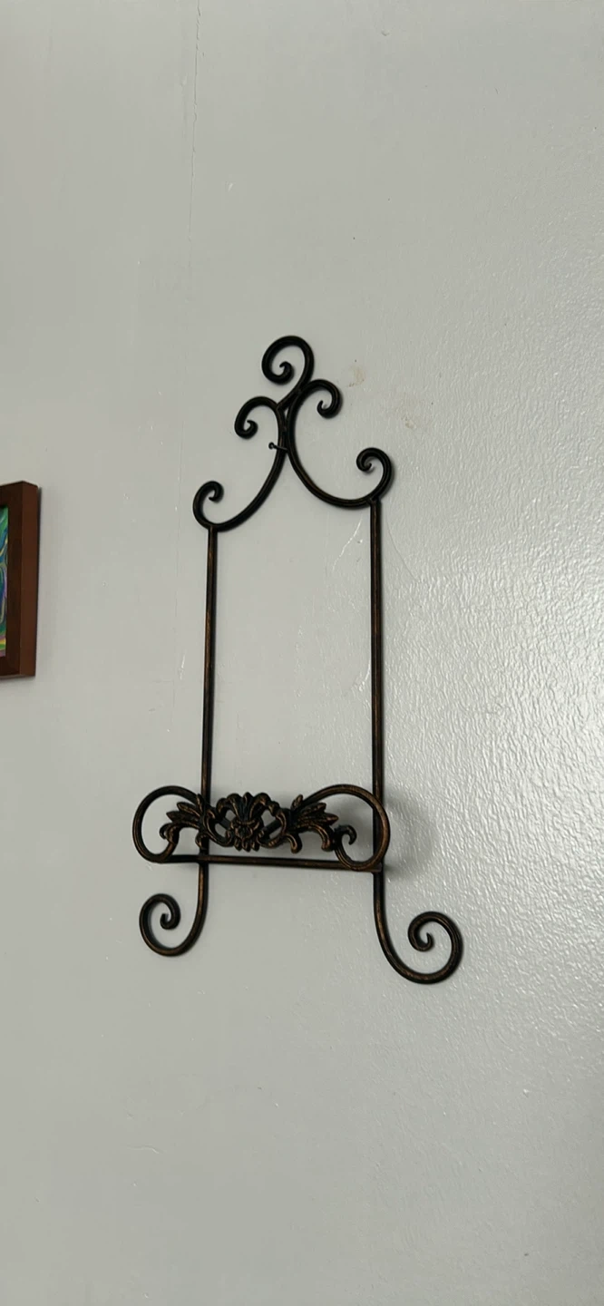 This is a decorative metal easel with an ornate scroll design. It's a bronze colour and stands about 19 inches tall. It's suitable for displaying small pictures or plates.