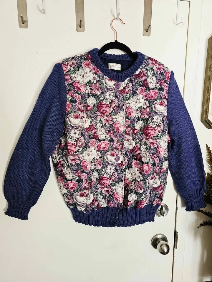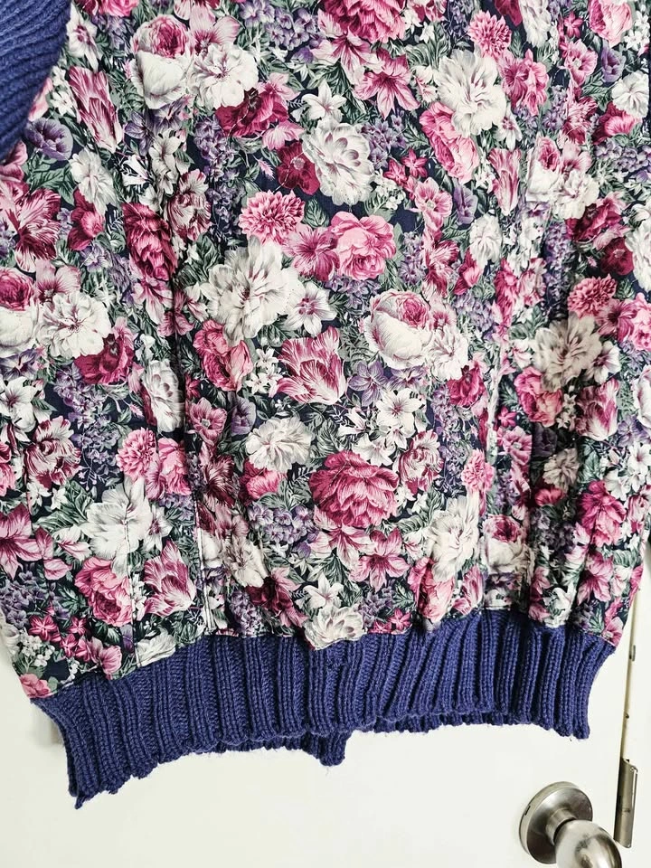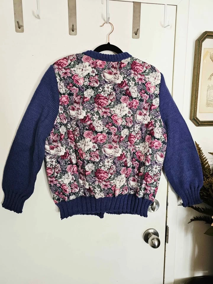 Cardigan is made of quilted floral cotton with a charming floral print in pink, purple, white and dark green, with thin poly insulation for warmth. The sleeves, collar and waistband are made of a chunky knit dark blue acrylic yarn, for a fun contrast of textures. It closes with purple geometric statement buttons. Perfect for cottagecore or grandmacore vibes when it's chilly out.