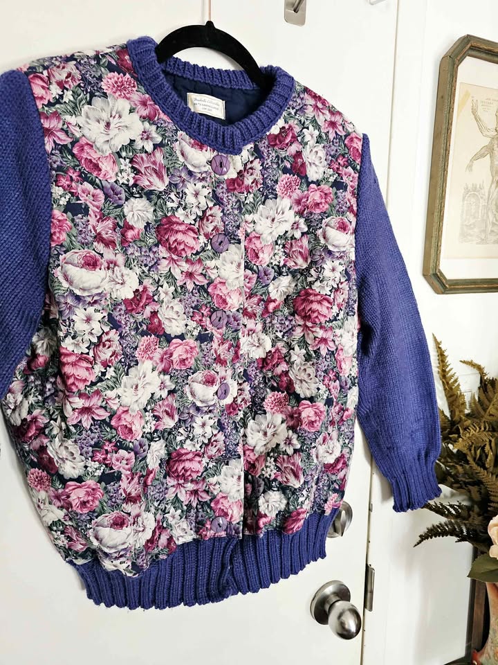 Cardigan is made of quilted floral cotton with a charming floral print in pink, purple, white and dark green, with thin poly insulation for warmth. The sleeves, collar and waistband are made of a chunky knit dark blue acrylic yarn, for a fun contrast of textures. It closes with purple geometric statement buttons. Perfect for cottagecore or grandmacore vibes when it's chilly out.