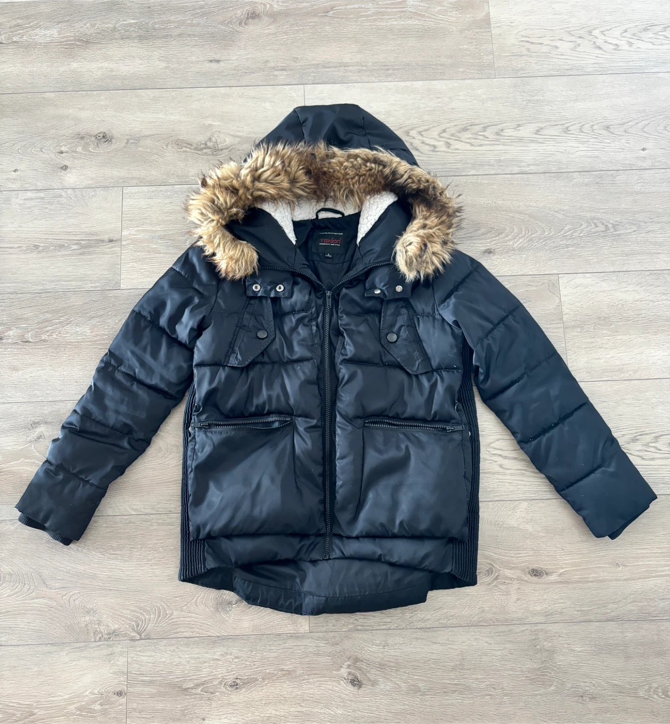 Selling a black winter jacket in size Large. The jacket features a soft Sherpa-lined hood and collar for extra comfort.