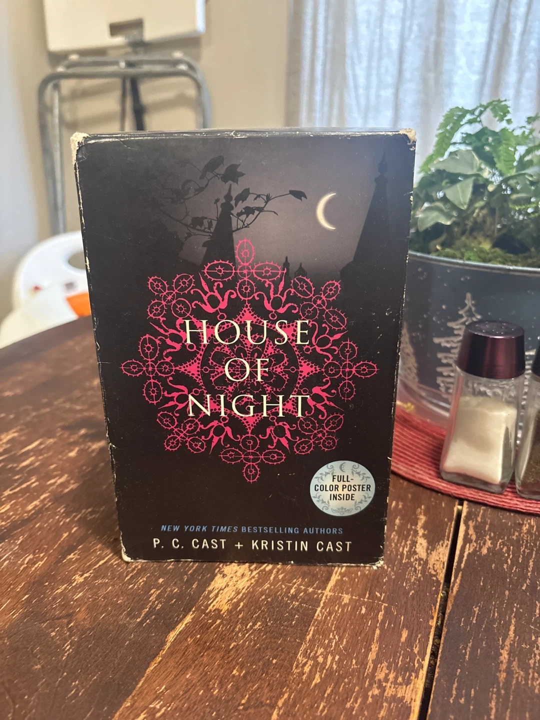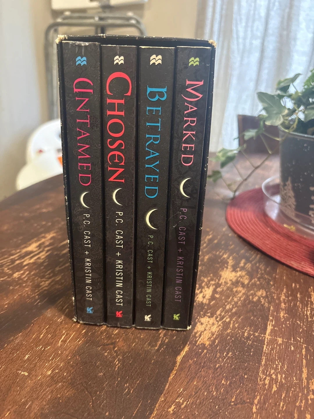 This box set includes four books from the House of Night series: Untamed, Chosen, Betrayed, and Marked. The authors are P.C. Cast and Kristin Cast. It also includes a full color poster inside.