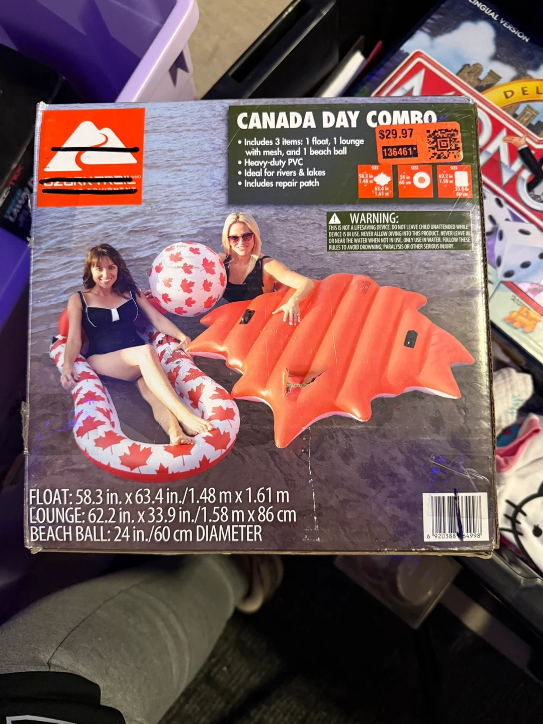 75Selling a brand new Ozark Trail Canada Day Combo float set! It includes one float, one lounge, and one beach ball. It also comes with a repair patch. Perfect for rivers and lakes!