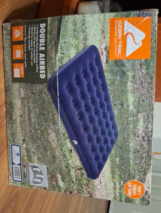 77Selling an Ozark Trail double airbed! It's great for both indoor and outdoor use. It features a comfortable flocked sleeping surface and sturdy coil beam construction. Contents include one airbed and a repair patch. Please note that a pump is not included