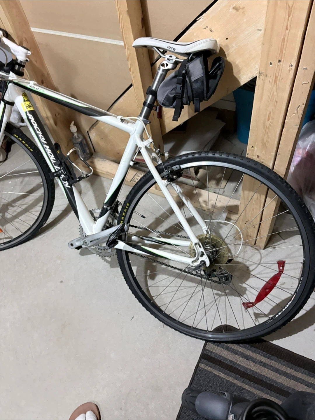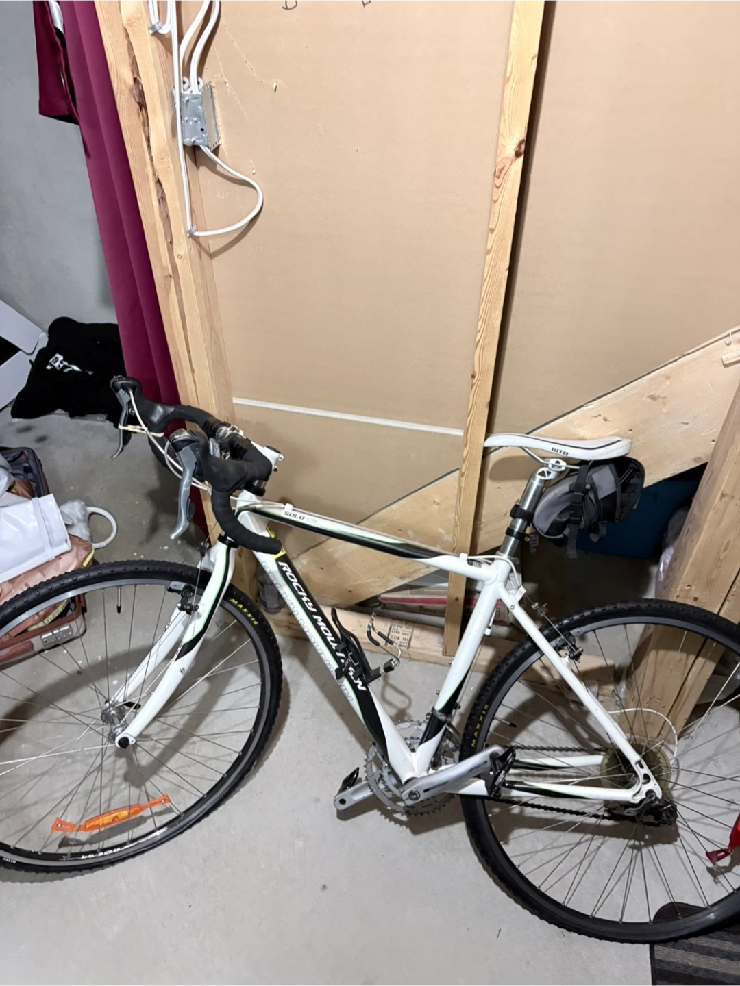 White Rocky Mountain Solo CX road bike with drop handlebars. It's equipped with WTB saddle and Maxxis tires. This bike's great for commuting or light trail riding!