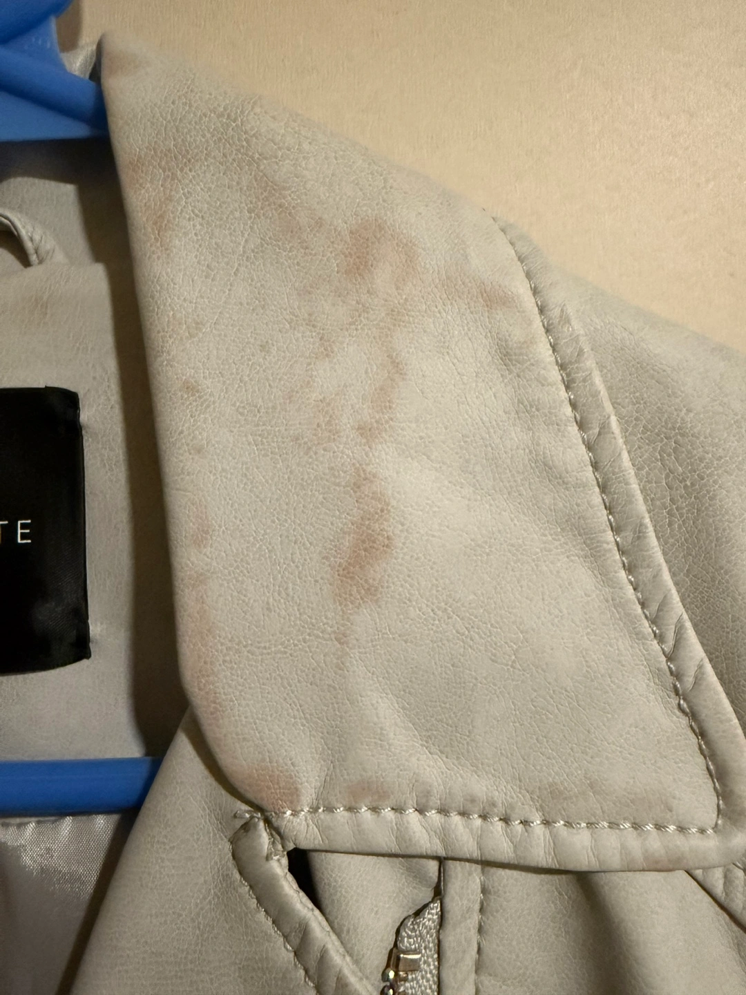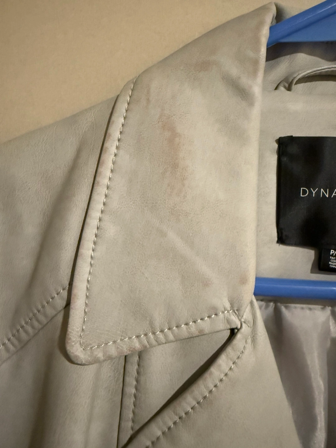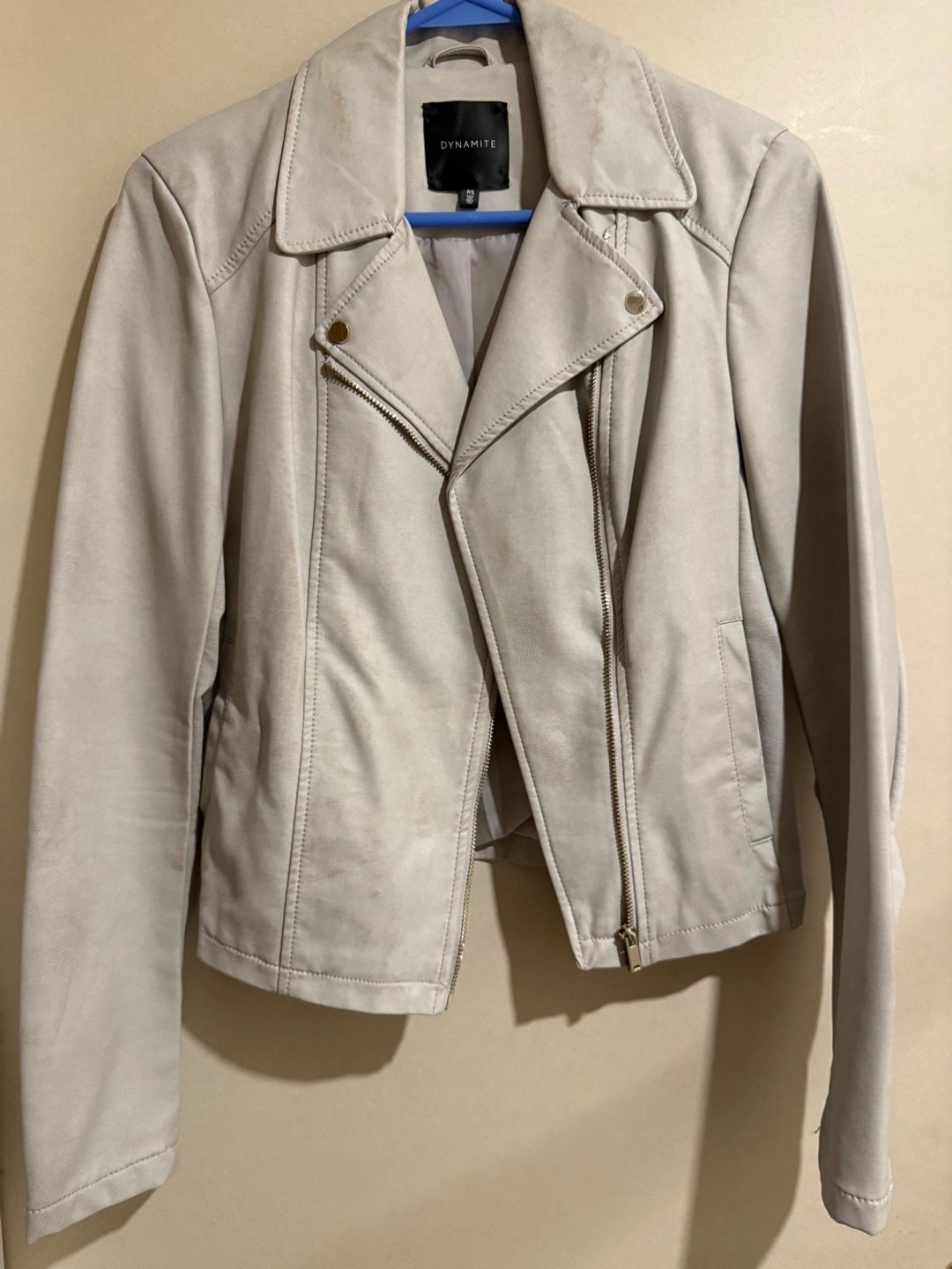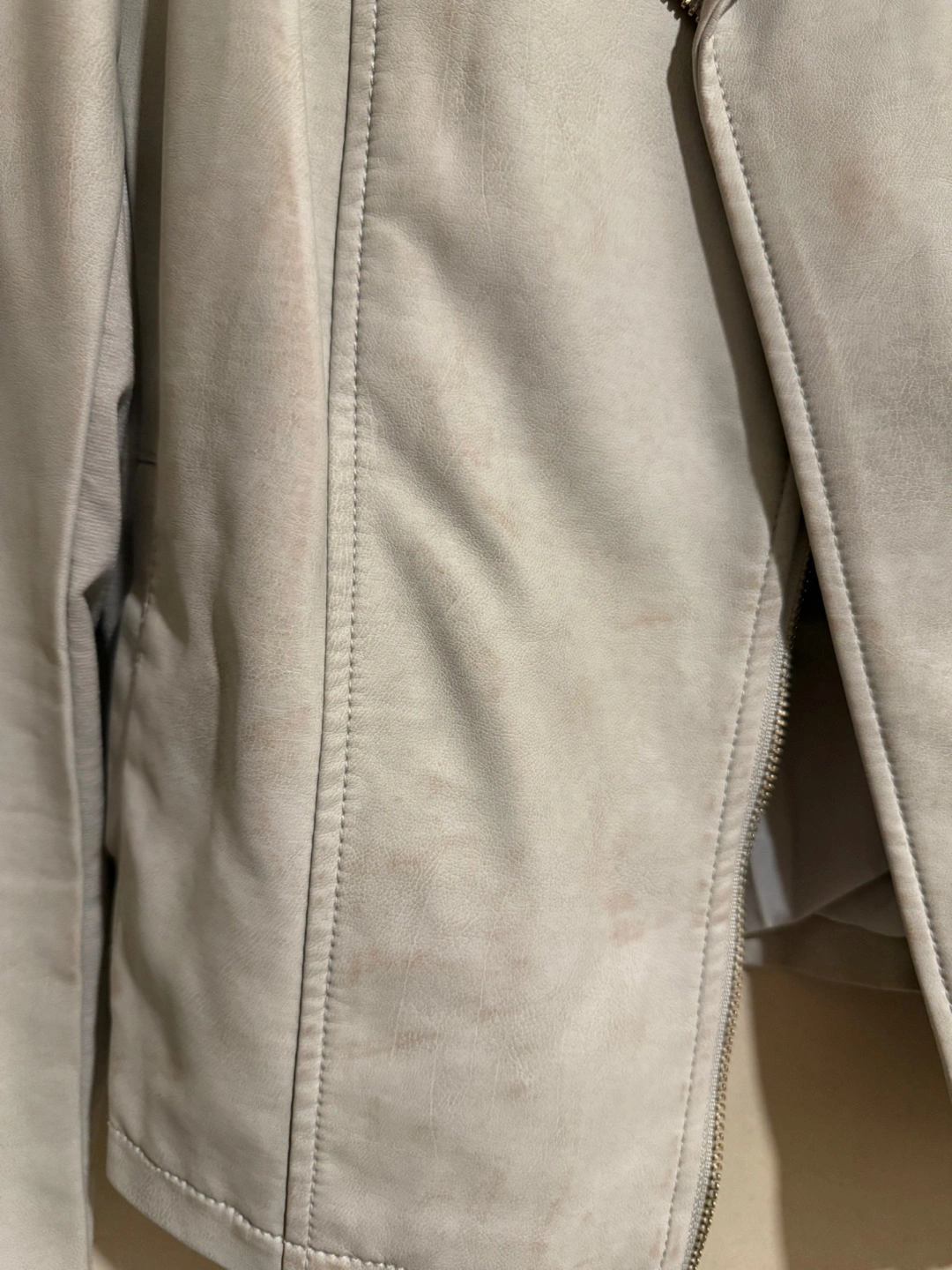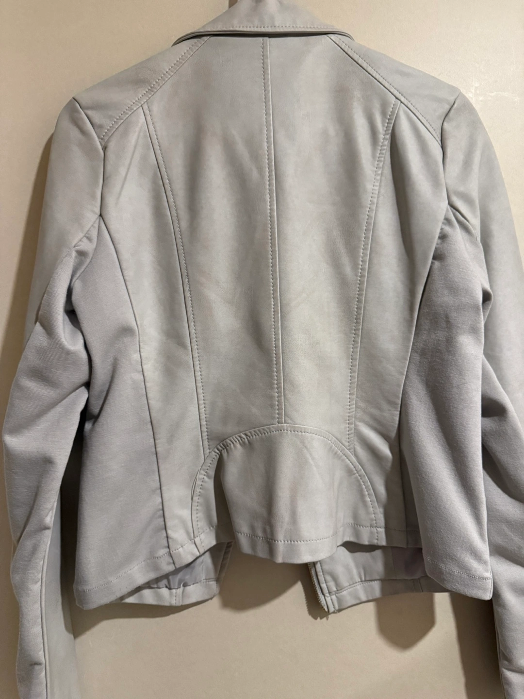 Women's grey faux leather jacket. Asymmetrical zipper closure. Long sleeves. Some minor discoloration on parts of the jacket