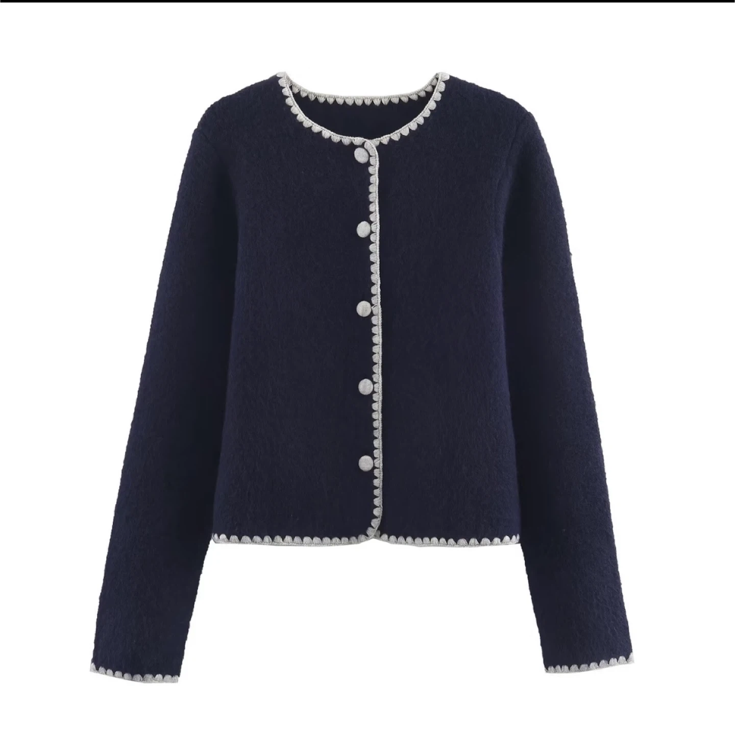 This Zara cardigan is a lovely navy blue colour. It features a scalloped white trim and white button-up closure. This piece is perfect for layering over a t-shirt or a light top.