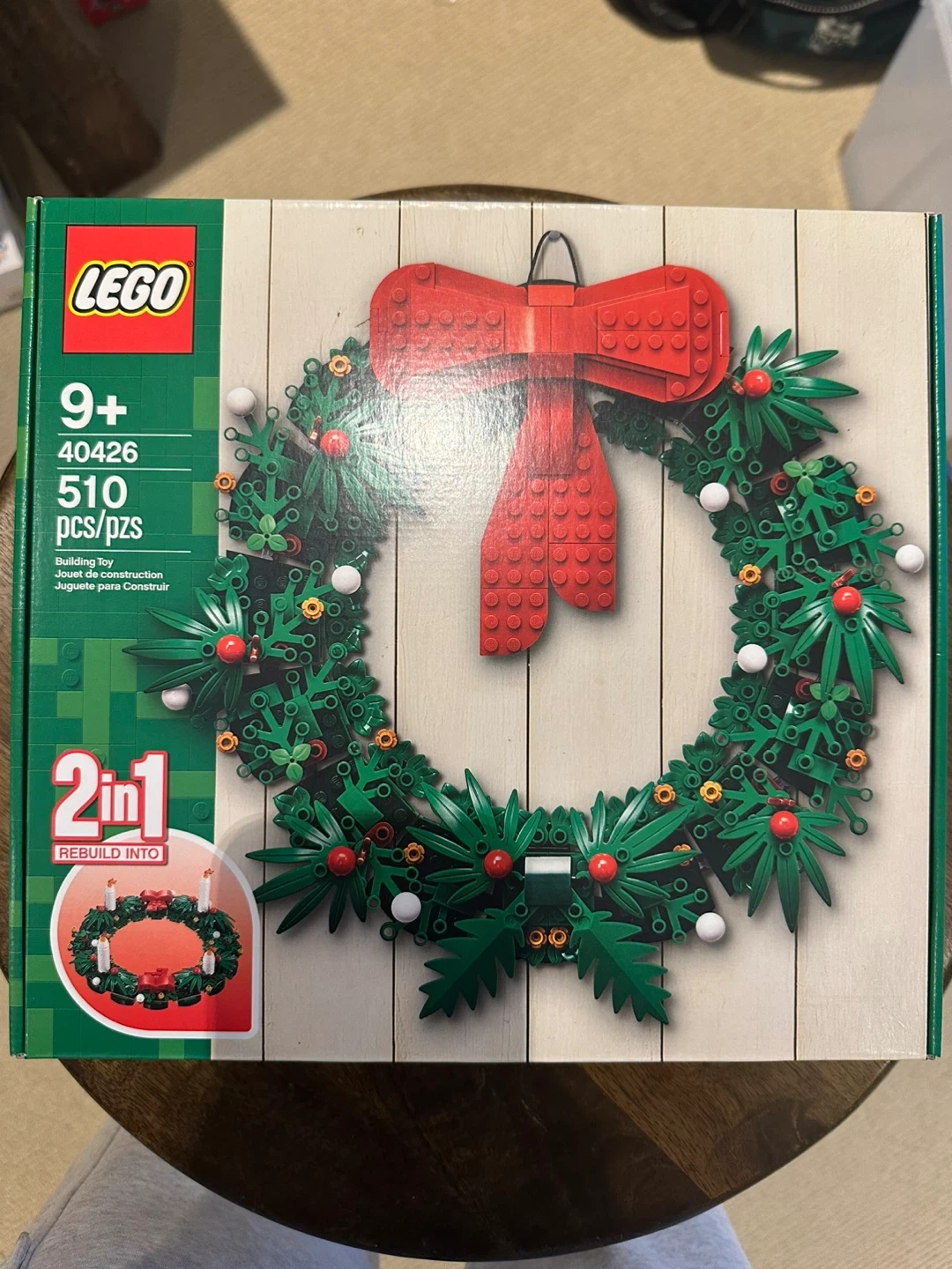 Build a festive 2-in-1 Christmas wreath from LEGO! It's a building toy with 510 pieces, recommended for ages 9 and up. You can rebuild it into a Christmas candle set