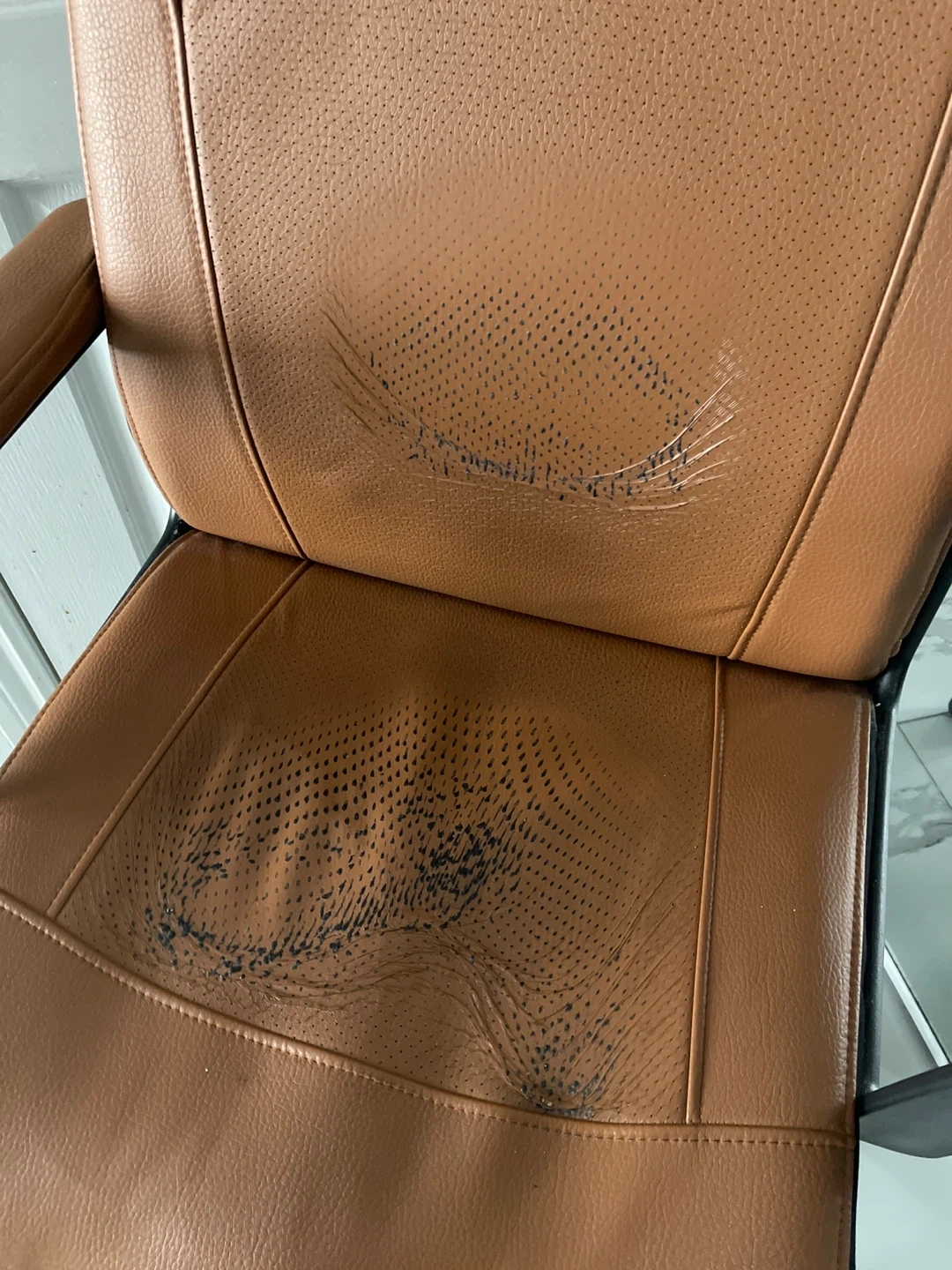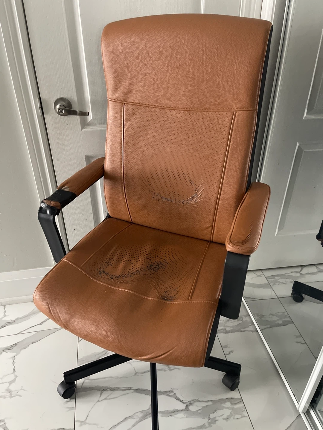 This is a brown office chair with visible wear and tear on the seat and armrests. It's a faux leather material. The armrests have been wrapped with black tape for temporary repair. Still functional for use.